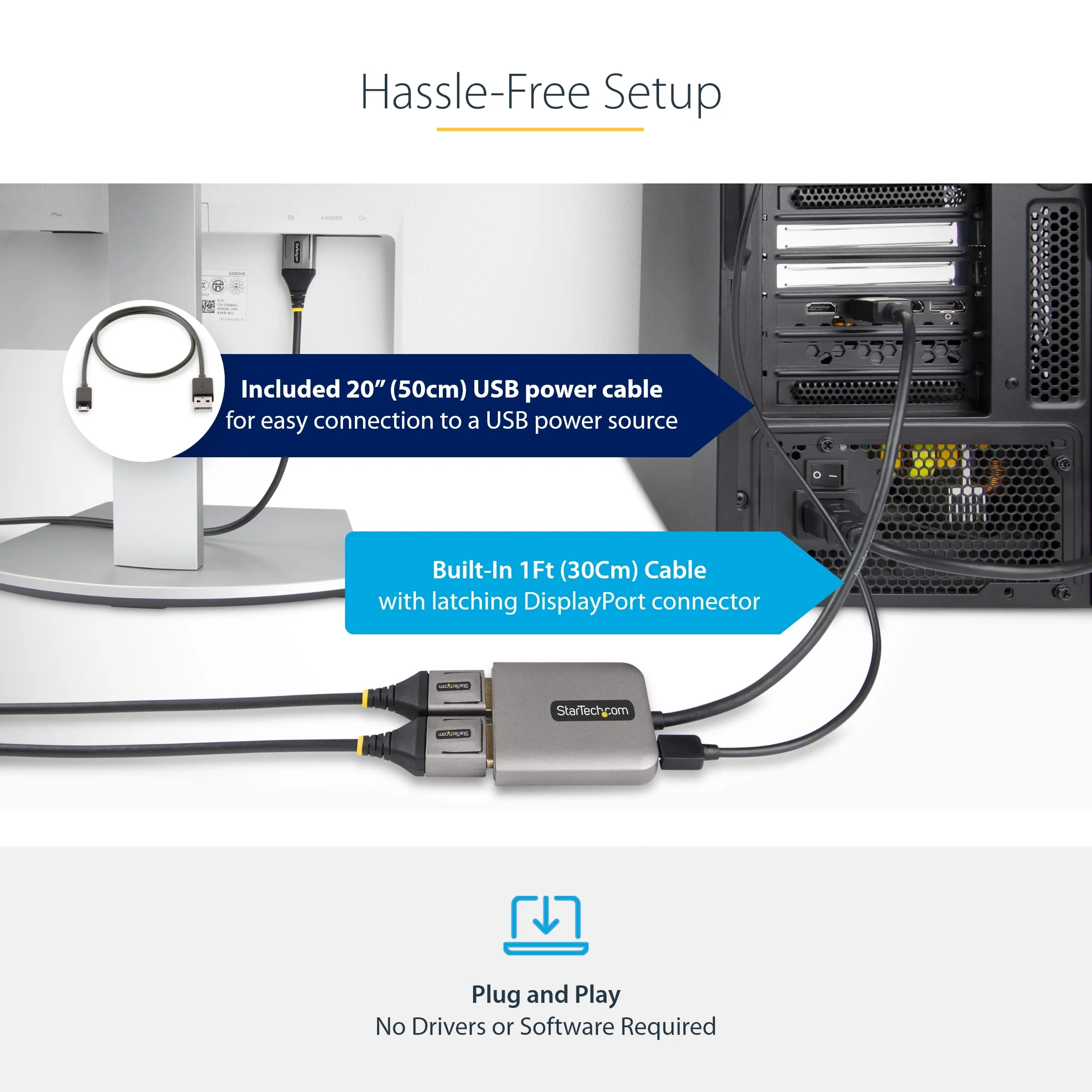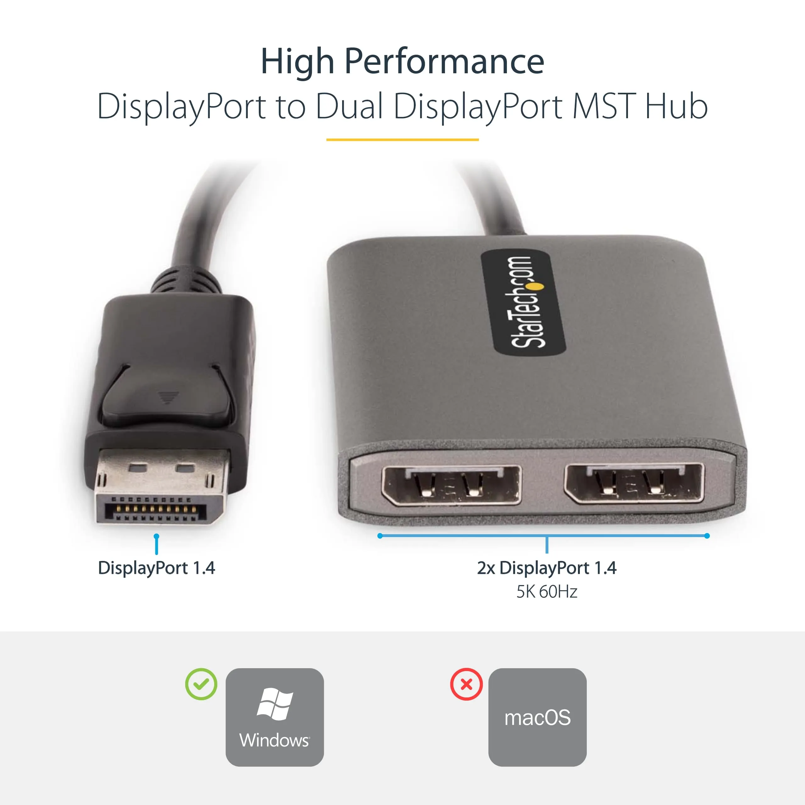 DisplayPort to Dual-DisplayPort MST Hub drives up to 2x 4K 60Hz displays using a DP 1.4 host - HDR; 2ch Audio; HDCP 2.2; Backwards compatible with DP 1.2 hosts at lower resolutions - Multi-monitor adapter adds two extended/mirrored displays; Utilize the host's built-in GPU capabilities; Driverless - Dedicated GPUs/11th gen and up Intel Processors with DP 1.4 for dual-4K 60Hz monitors; DP 1.4 with DSC required for dual 5K 60Hz - 1ft built-in cable; 20in USB power cable included; Windows Only.