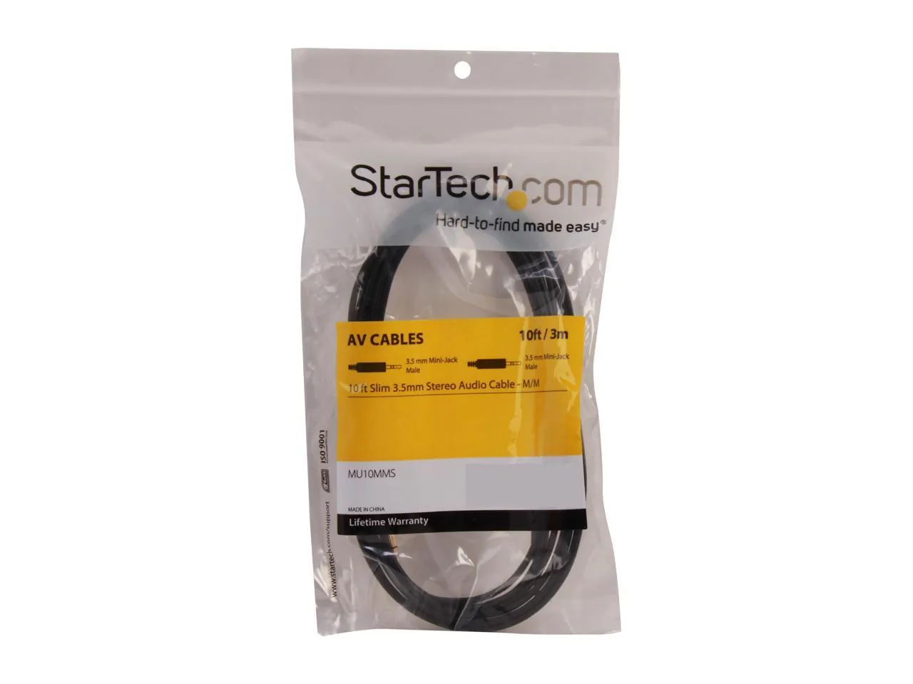 This 10-foot Slim 3.5mm Stereo Audio Cable by StarTech.com provides high-quality audio performance for connecting devices with a male-to-male connection. Ideal for home theaters, car audio systems, and portable devices, this cable ensures clear sound without interference.