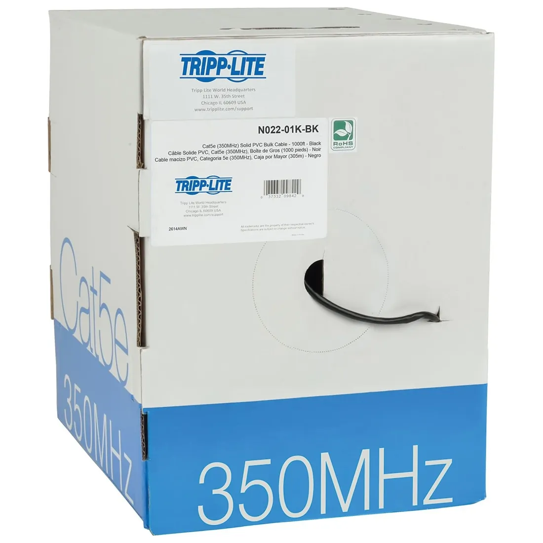 Tripp Lite N022-01K-BK Cat5e 350 MHz Bulk Solid-Core PVC Cable, Black, 1000'., TAA:Ideal for all non-plenum horizontal wiring applicationsRated for 350 MHz/1 Gbps communicationsHigh-quality 24 AWG 4-pair solid copper wire
