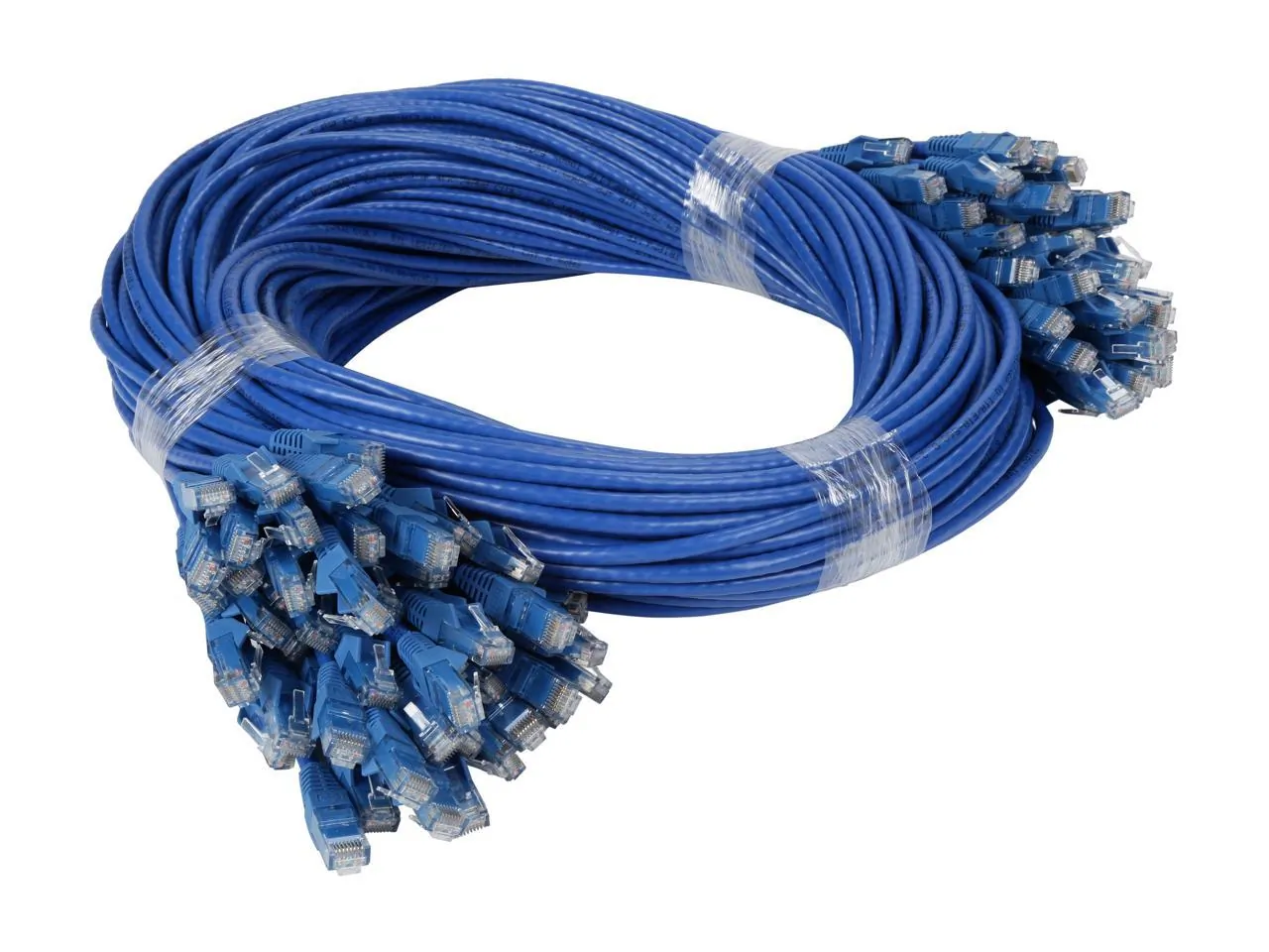 50 piece bulk pack of 5-ft. Blue Cat6 patch cablesMeets Category 6 cabling standardsPremium cabling for Category 6, Category 5e and Category 5 applicationsLength: 5-ft. / Color: Blue / Connectors: RJ45 maleDrastically reduce impedance & structural return loss compared to standard 100MHz wireHigh-quality copper wire and a staggered-pin plug design to keep near-end crosstalk levels to a minimumFeature molded connectors with integral strain reliefSnagless design protects the locking tabs on the RJ45 connectors from being damaged or snapped off during installationPVC 4-pair stranded UTPDeliver stable performance up to 550MHz/1 Gbps communicationMeets most current industry standards including IEEE 802.3ab, IEEE 802.5, ANSI/EIA/TIA 568, ISO/IEC 11801 and ETL (category 6 draft 11)Available in other colors and lengthsSystem Requirements For 1000 Base-T (1Gbps Ethernet), 10/100 Base-T (Ethernet), 100 Mbps TPDDI, 155 Mbps ATM, ISDN, voice and Token Ring TYPE 3 applications as well as EIA/TIA applications. Package Includes 50 pieces of 5-ft. Blue Cat6 Gigabit Snagless Molded Patch CablesINPUT Cable Length (m) 1.5 Cable Length (in.) 60 Cable Length (cm) 152.4PHYSICAL Cable Shielding UTP Color Blue Shipping Dimensions (hwd / cm) 45.72 x 50.80 x 0.25 Shipping Weight (kg) 3.49 Snagless Connector Yes Wire Type StrandedCOMMUNICATIONS Network Speed 1Gbps CONNECTIONS Side A - Connector 1 RJ45 (MALE) Side B - Connector 1 RJ45 (MALE) FEATURES & SPECIFICATIONS Technology Cat6 CERTIFICATIONS Certifications RoHS-Compliant