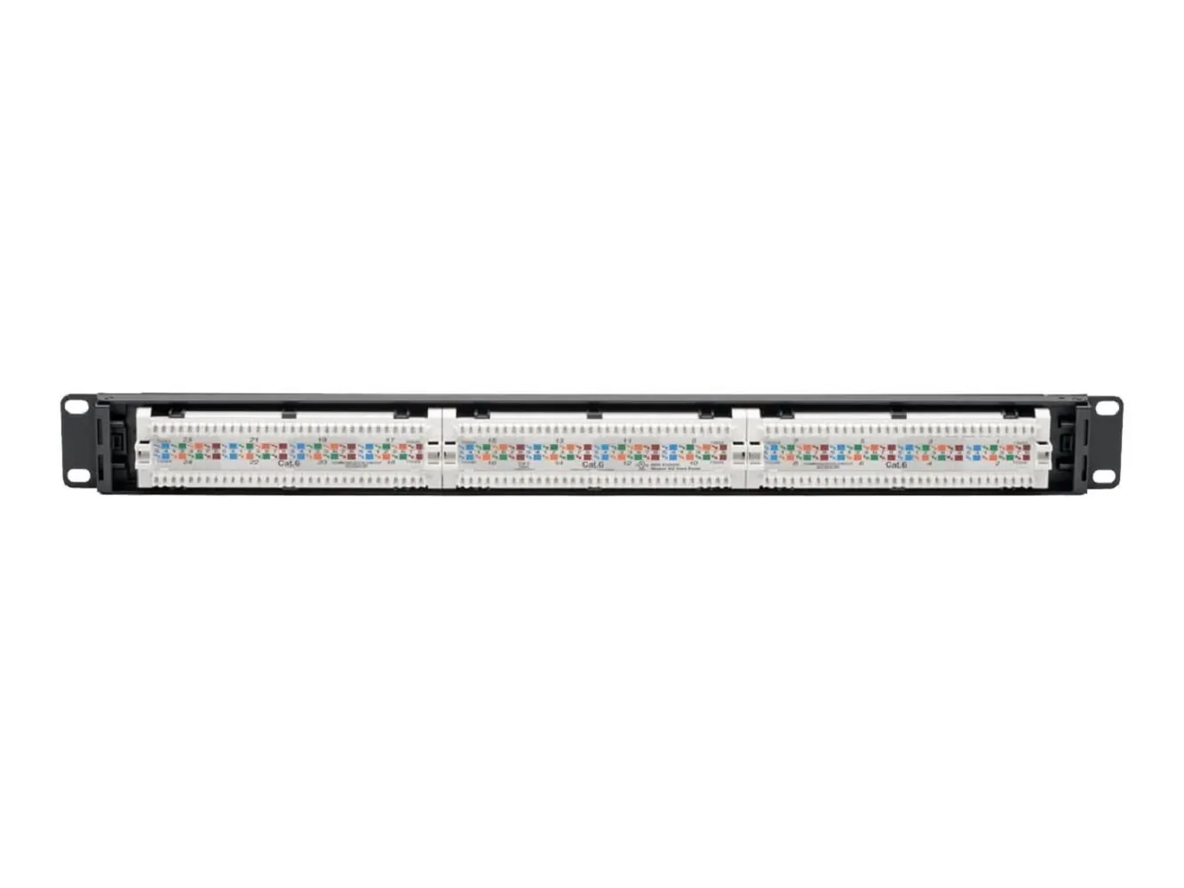Power over Ethernet patch panel prevents spark-gap erosion that can affect transmission24 RJ45 and punchdown ports numbered/labeled for immediate cable identificationMounts easily into 1U of space in your EIA-standard 19 in. rack for immediate useSupports EIA/TIA 568A/B wiring standards for either 110 or Krone-type terminationsIdeal for managing Cat6 cable patching in high-density IT environmentsProduct Type Network Patch PanelInterfaces/Ports Total Number of Ports 24 Number of Network (RJ-45) Ports 24Color BlackForm Factor Rack-mountableCompatible Rack Unit 1UCompatible Rack Width 19"Height 4.4cm Width 47.98cm Depth 11.13cmPackage Contents N252-P24 24-Port 1U Rack-Mount Cat6 Patch Panel - PoE+ Compliant Cable Management Bracket 8 x Cable Ties Quick Start Guide