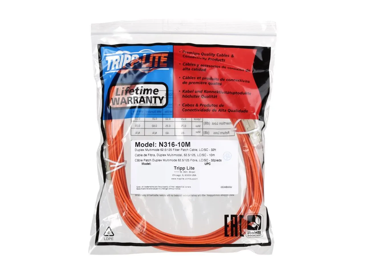 Tripp Lite's 10-meter ( 30-33ft ) multimode duplex fiber optic SC/LC patch cable is manufactured from 62.5/125 zipcord fiber. The cable has LC to SC connectors, a PVC jacket and is FDDI and OFNR rated. Duplex multimode fiber is most commonly used in LAN applications. Tripp Lite warrants this product to be free from defects in materials and workmanship for life. Manufactured from 62.5/125 duplex (zipcord) fiber PVC jacket Length: 10-meter (30-33ft) Connectors: 2 SC/LC connectors on each end Insertion loss testing performed on every connector (0.2db typical) and provided with cable Beveled edge on ends of glass makes insertion of plug a breeze Fiber made from glass (not a polymer) Color coded shrouds identify transmit and receive Tripp Lite warrants this product to be free from defects in materials and workmanship for life System Requirements Any fiber optic hardware or NIC card requiring multimode duplex cable with SC/LC connectors Package Includes 10 meter ( 30-33ft ) Duplex MMF Cable LC/SC 62.5/125 Fiber .