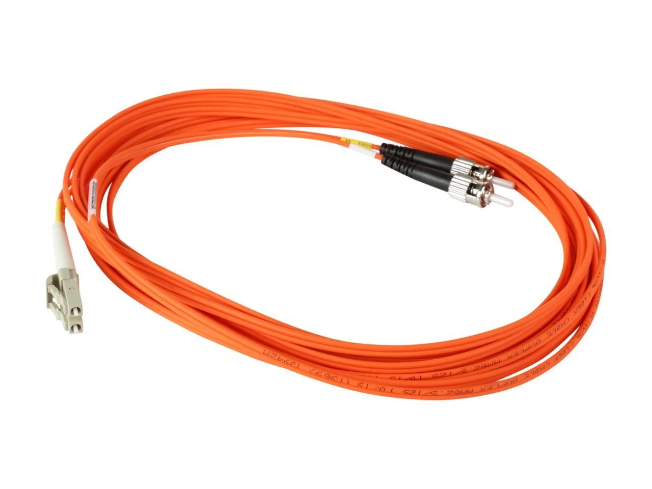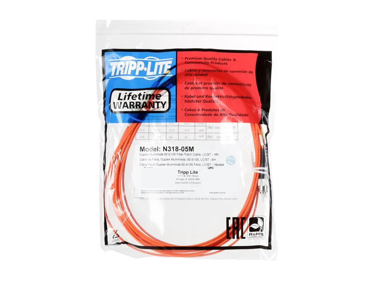 This Tripp Lite 5M Duplex Multimode Fiber Optic Patch Cable provides a reliable connection for high-speed data applications. With a length of 5 meters (16.4 feet), it features ST male to LC male connectors, allowing for compatibility with various devices in fiber optic networking.