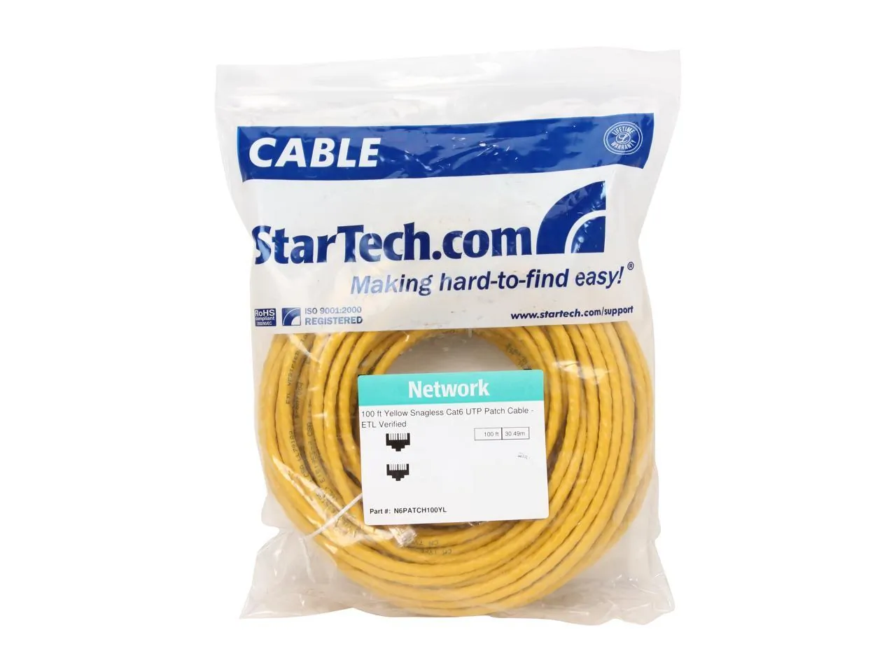 The StarTech.com N6PATCH100Y is a high-quality 100-foot Cat 6 yellow snagless UTP patch cable that is ETL verified. This reliable cable is designed for high-speed network connections, providing excellent performance for both voice and data applications.