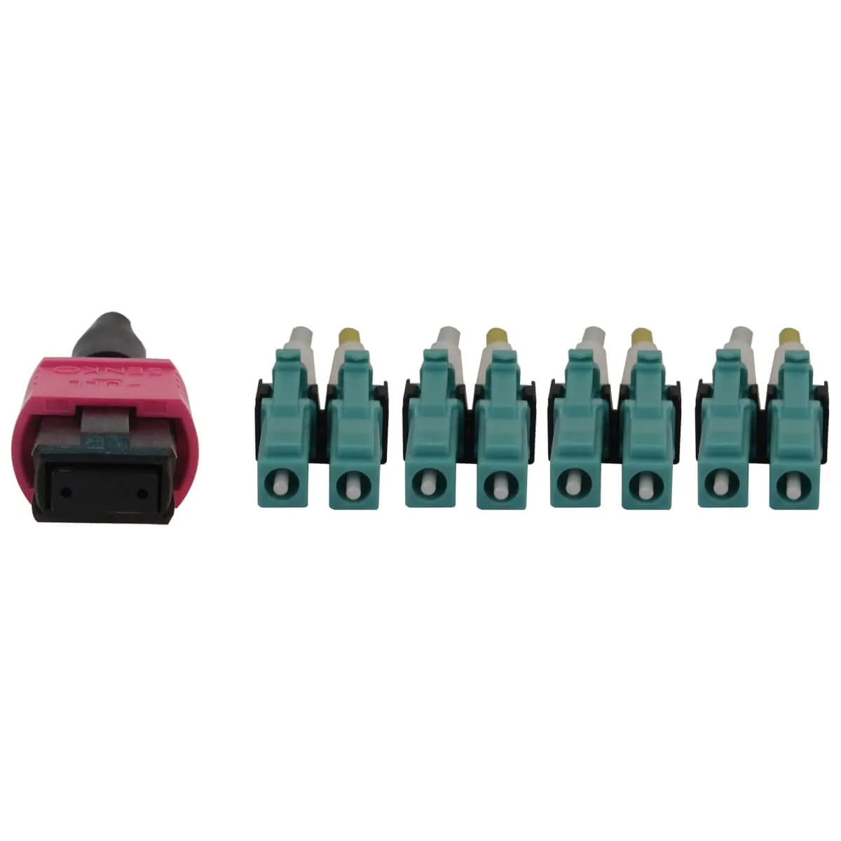 This high-quality fiber optic cable is designed for reliable and efficient data transmission. It features 12 fiber strands with MTP/MPO connectors on one end and 4 LC connectors on the other, ensuring optimal performance for network setups.