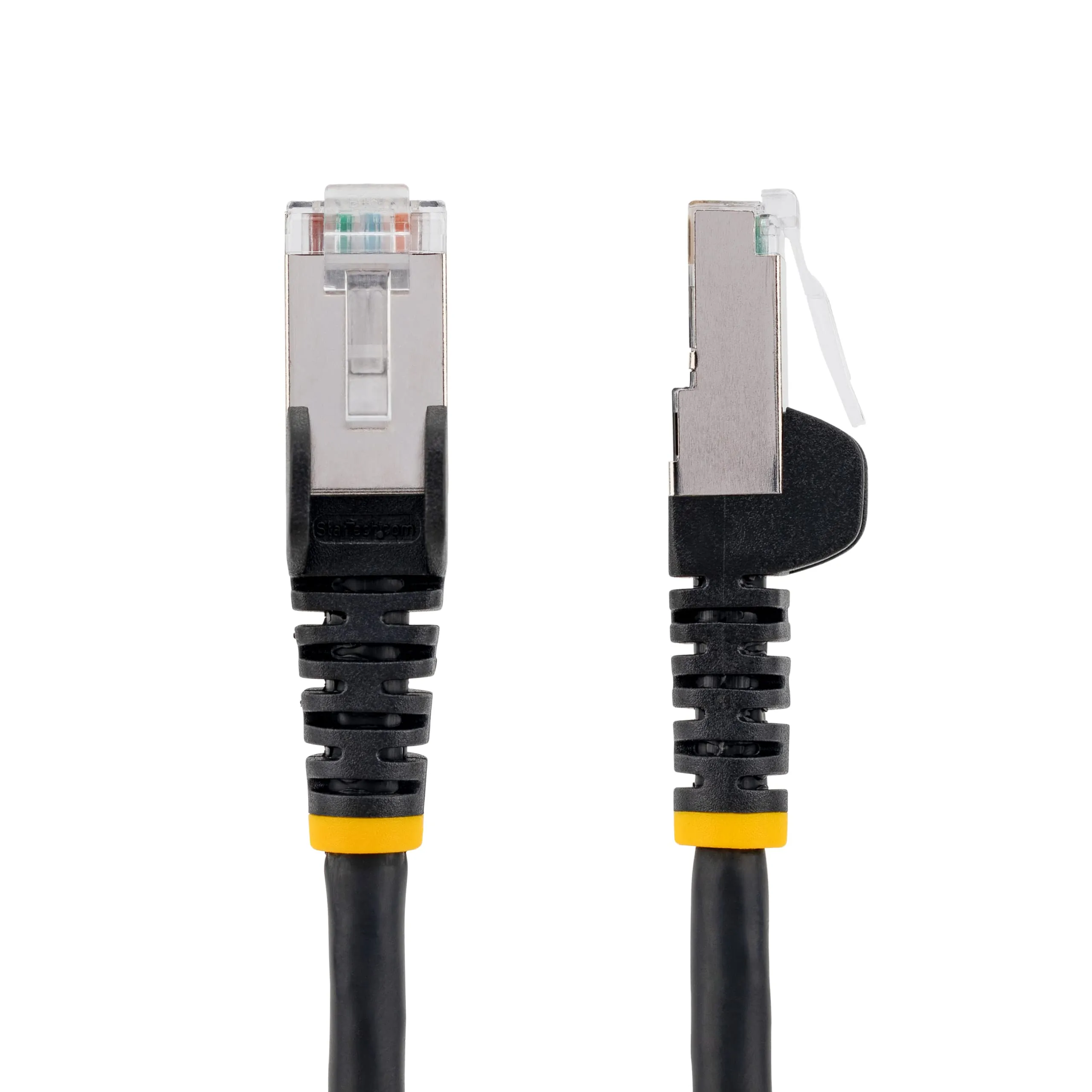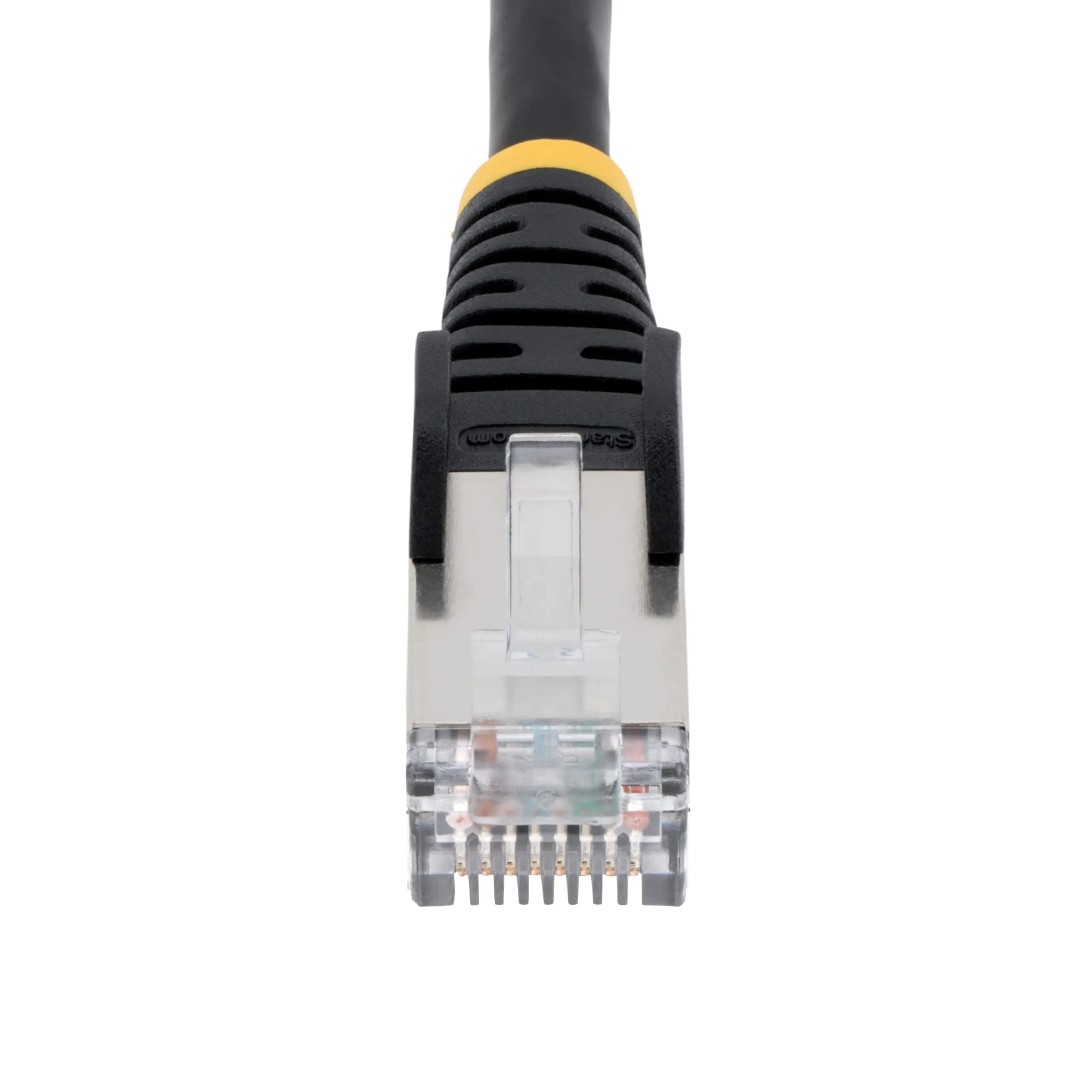 Snagless S/FTP Cat6a cable is optimized for 10G networks; Supports up to 100W PoE; Ideal for 10GBASE-T switches/PoE devices such as IP cameras/Access Points - 500MHz range enhances signal reliability; Low Near-End Crosstalk (NEXT) and Return Loss (RL) - Gold-plated connectors; 27AWG pure bare copper w/braided shield; Low Smoke Zero Halogen (LSZH) jacket is safe for enclosed/poorly ventilated spaces - 50-foot; Black; Snagless; 10Gbps; 100W PoE++; S/FTP; 0.22in O.D.; Fluke Tested/ETL Verified