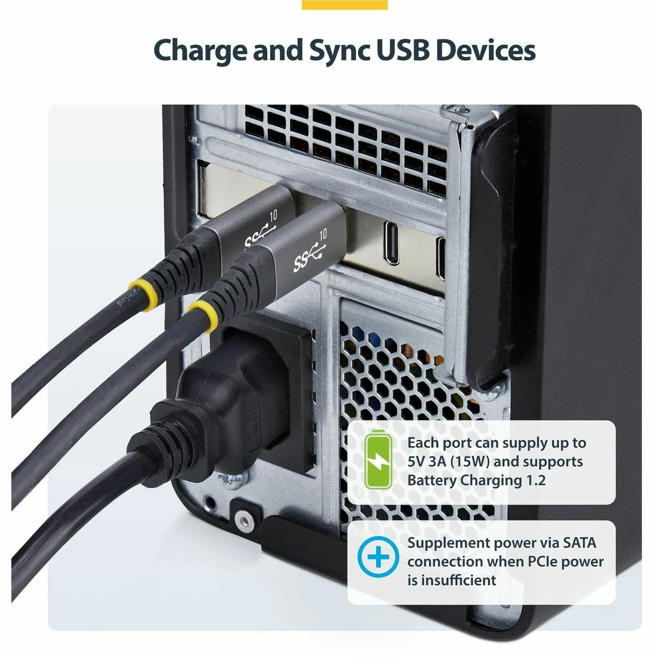 - Enhance a desktop computer/server with this 4-port USB 3.2 Gen 2 Type-C card; Features individual USB controllers for up to 10Gbps per port; PCI Express 3.0 x4 - Ideal for file transfers/real-time photo and video editing on external storage/10GbE USB network adapters - Supports Windows/Linux/macOS; PCIe USB-C card ships w/ low-profile bracket (standard included) - Supports 10/5Gbps and 480/12/1.1Mbps; If PCIe power is insufficient a built-in SATA port can supply extra power; Max 15W per port