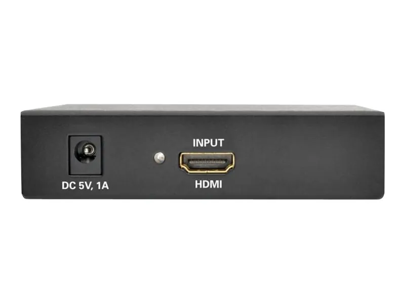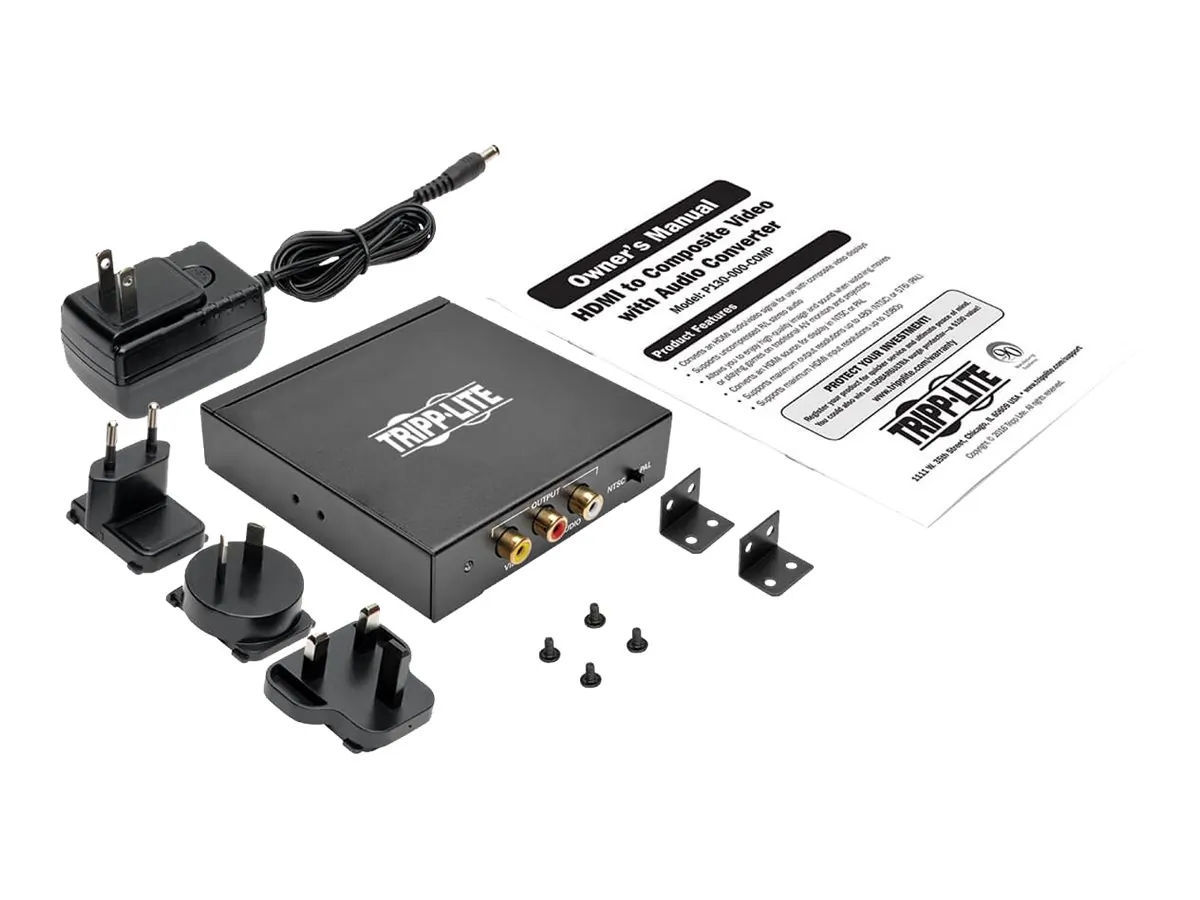 ? Connects an HDMI(R) source to a TV or monitor equipped with RCA composite video connections ;? HDMI(R) female input to RCA composite video & stereo audio female outputs ;? Supports video output resolutions up to 480i (NTSC) & 576i (PAL) ;? Compliant with NTSC & PAL video formats ;? Supports uncompressed right/left stereo audio ;? HDCP compliant ;? Supports input video resolutions of 480i, 480p, 576i, 576p, 720p, 1080i & 1080p at 50Hz & 60Hz ;? Plug & play--no drivers or software necessary ;? Mounts to a wall or other surface ;? Includes external power supply with NEMA 1-15P plug & 3.5ft cord, mounting hardware & owners manual;