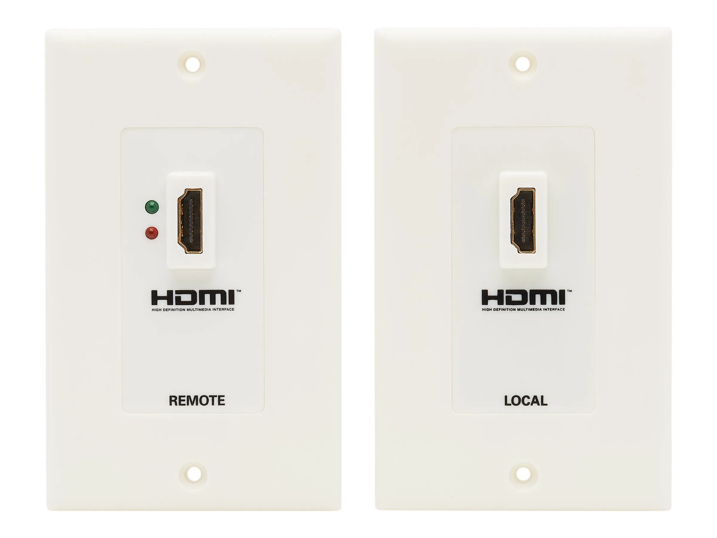 With the Tripp Lite P167-000 HDMI Over Cat-5 Wall Plate Kit, you can locate an HDMI-enabled display up to 230' away from the HDMI source using readily available Cat-5 or Cat-6 UTP cable (for best performance, use solid wire). The wall plate extender consists of a passive wall plate at the source side and an active wall plate with built-in signal regenerator at the display side. Simply run two Cat-5/6 UTP cables between the two wall plates and plug in standard Tripp Lite HDMI patch cables to the HDMI source and the display. The green LED on the display wall plate lets you know that power and a signal are coming from a connected source. The red LED indicates only a signal is being received. The Tripp Lite P167-000 HDMI Over Cat-5 Wall Plate Kit is functioning properly when the unit is connected to a display and the green LED is lit.