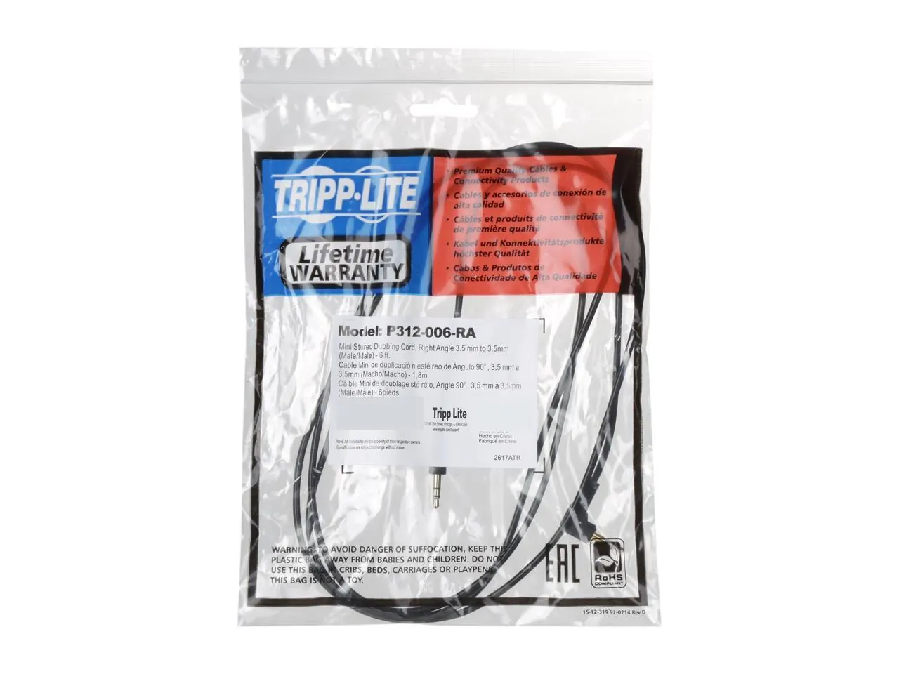 Tripp Lite 6ft Mini Stereo Audio Cable with One Right Angle Plug 3.5mm M/M 6' - Audio cable - stereo mini jack male to stereo mini jack male - 6 ft - black - right-angled connector
