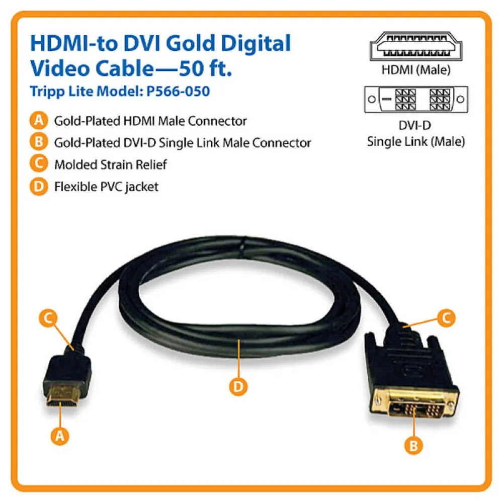 Tripp Lite's 50ft DVI - HDMI ( High Definition Multimedia Interface ) cable allows interconnection between digital display devices, such as DTV's ( Digital Television ), Plasma displays, LCD TV's, and projectors, to Digital source devices, such as Digital Set-Top boxes, DVD/DVD-R players, and AV receivers. HDMI DTV's will display video received from existing DVI-equipped products, and DVI-equipped TVs will display video from HDMI sources. The DVI-HDMI adapter does not support audio.