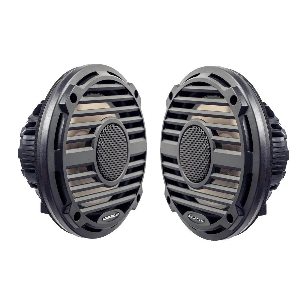 Looking for high-quality sound with a classy, modern aesthetic? The PRO Classic 6.5” Speakers in black featuring a traditional grill-style, customizable lighting via the RGB Controller, and our Aquatic AV logo badge boast 120 watts total power and RGB cone illumination so your sound can be as potent as the experience is fun. Built for durability, these multi-environment speakers are fully waterproof as well as UV/salt/fog resistant to ensure they last as long as possible. If you’re looking for high-quality sound and an immersive entertainment experience, look no further than the PRO Classic 6.5″. Pair with the PRO Classic 10″ Subwoofer for the ultimate audio experience.