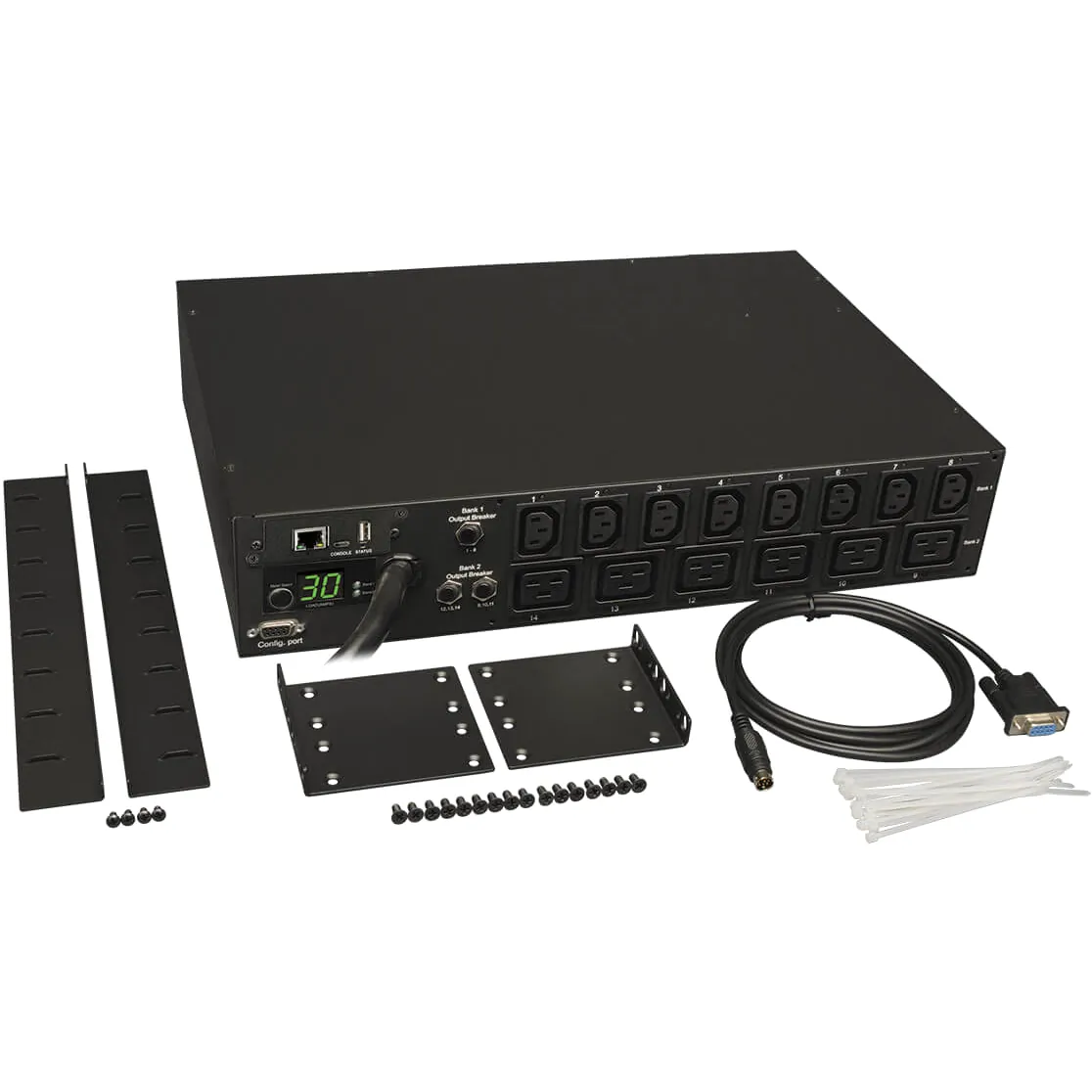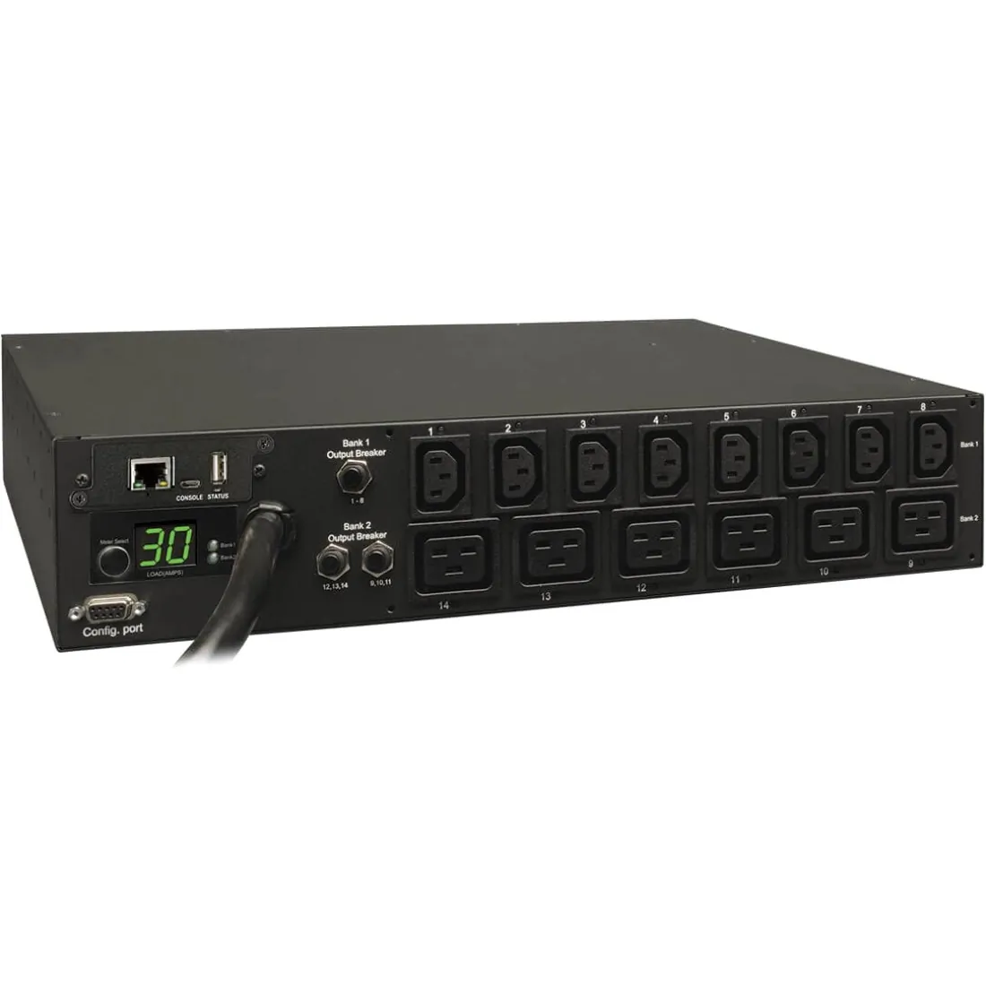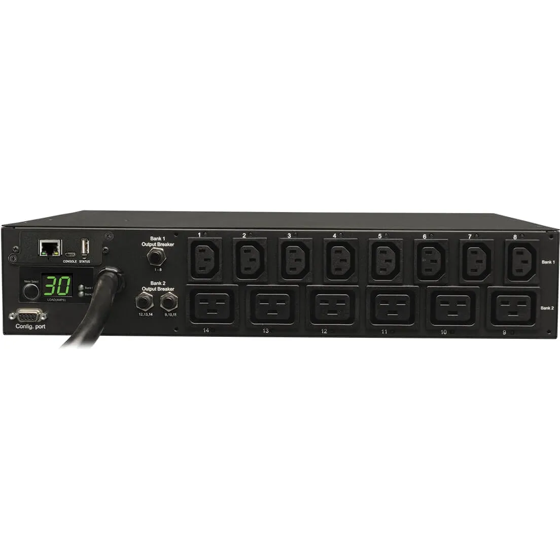 Tripp Lite Switched 208V 14-Outlet PDU:Supports 30A maximum capacity at 208/240V (agency de-rated to 24 amps)Includes attached L6-30P input plug and 14 switched outlets (8 C13 and 6 C19)Tripp Lite PDU features visual and remote current monitoring tracks total output current