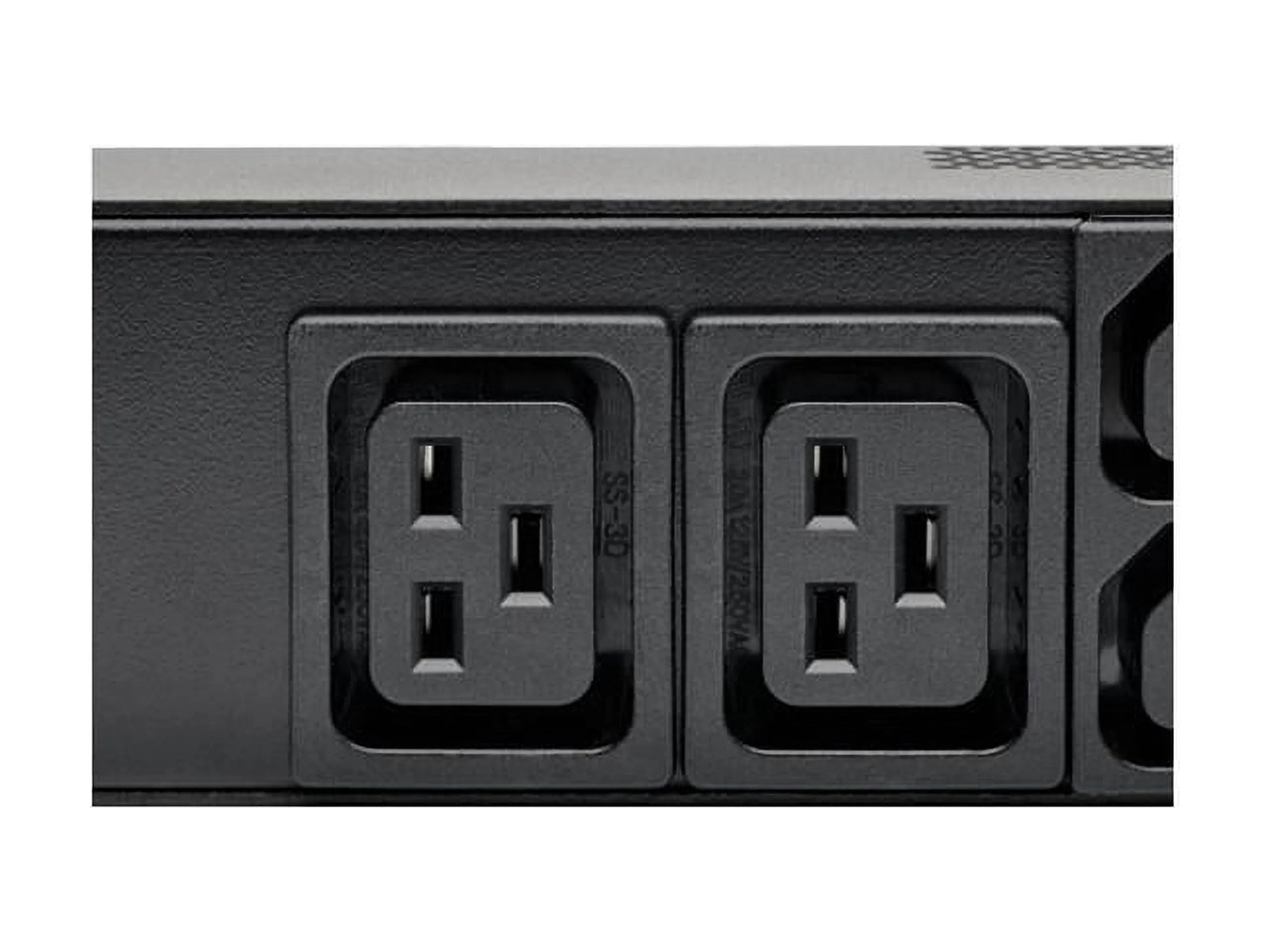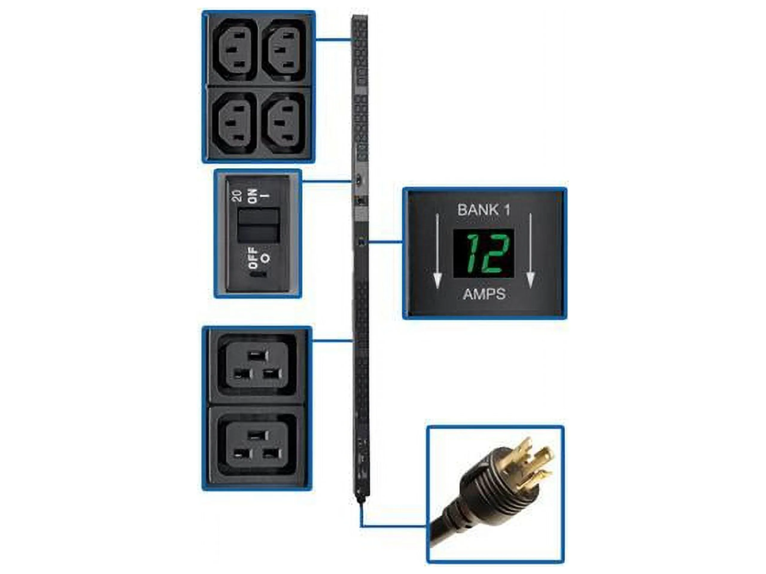 Tripp Lite PDU Metered 208/240V C13/C19 - Digital Meters Help Prevent Overloads, Dual digital ammeters report real-time output current in amps, Visual monitoring of PDU load level prevents overloading as more equipment is connected Distributes Plenty of Single-Phase Power 30A 208/240V 5.8kW metered PDU (agency derated to 24A continuous)r Dual load banks with separate 20A circuit breakers and digital ammeters, 48 outlets, 24 per bank (4 C19 and 20 C13) distribute single-phase power to connected equipment, Special guards prevent breakers from accidentally tripping, Each bank is color-coded and labeled for convenient identificationConnects to AC Power Source, NEMA L6-30P input plug with 10 ft. (3 m) cord for easy connection to main power source, generator or protected UPS, Included plug-lock inserts ensure components remain connected and powered. Included ground screw for equipment requiring chassis groundEasy to Mount With or Without Tools. Ready for immediate toolless 0U installation using preinstalled 9 mm mounting buttons (spare 2.9 mm and 4.6 mm buttons included) Nut-and-bolt vertical installation possible with included mounting hardware. Use included PDUMVROTATEBRKT mounting accessory for installation with outlets facing rearTAA-Compliant. Compliant with the Federal Trade Agreements Act (TAA) for GSA Schedule purchases.