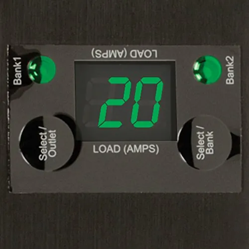 Digital display reports load level in amps for LOAD BANK 1 (Outlets 1-12), LOAD BANK 2 (Outlets 13-24), LOAD BANKS 1 and 2 COMBINED (Outlets 1-24) and each individual output receptacle, Digital display can also be used to scroll the configured IP address