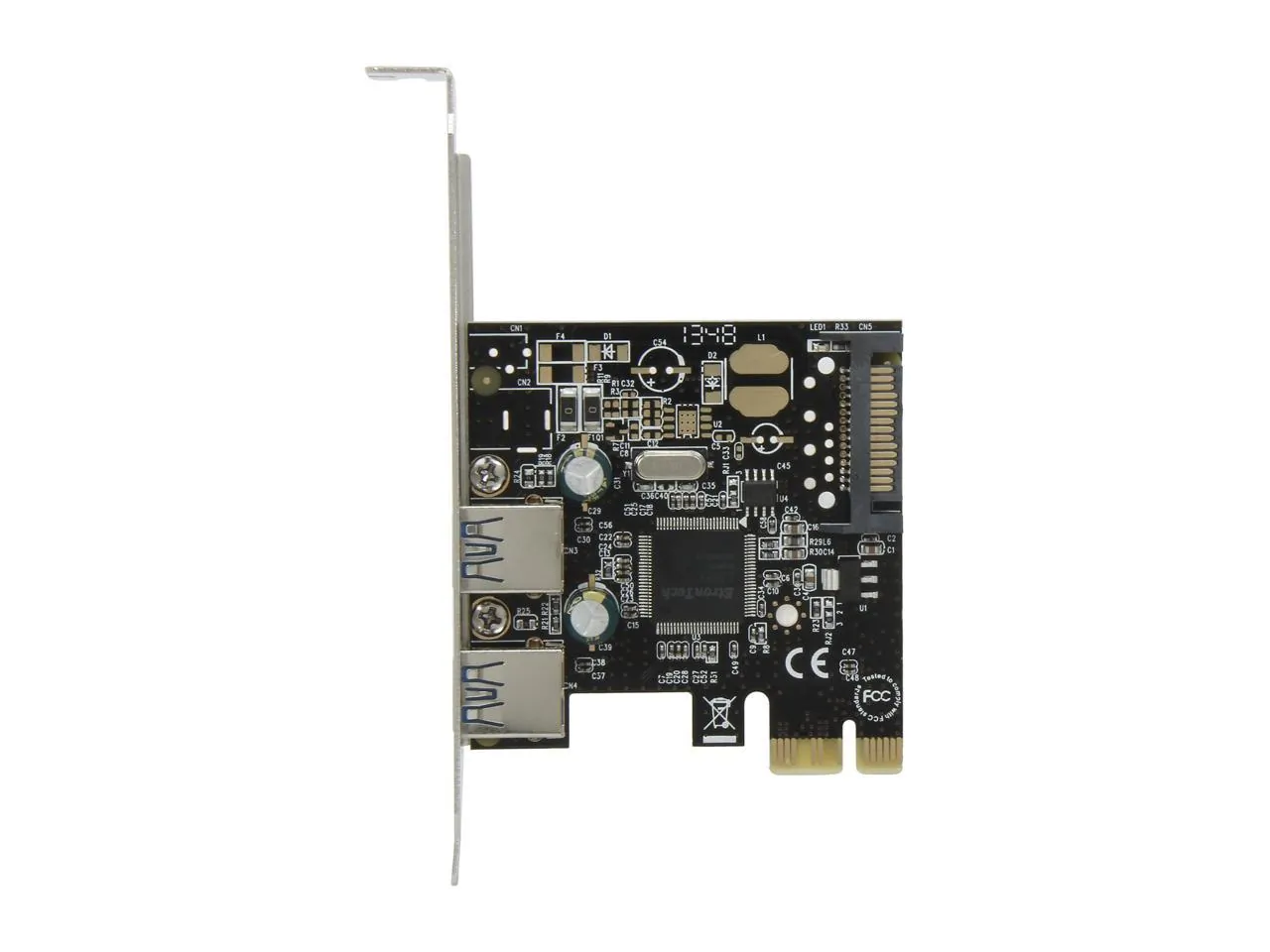 Hardware Bus Type:PCI Express Card Type:Standard Profile (LP bracket incl.) Chipset ID:Etron - EJ168A Interface:USB 3.0 Port Style:Integrated on Card Ports:2 Connector(s) Connector Type(s):1 - PCI Express x1 Male External Ports:2 - USB 3.0 A (9 pin SuperSpeed) Female Internal Ports:1 - SATA Power (15 pin) Plug Performance Maximum Cable Length:9.8 ft (3 m) Type and Rate:USB 3...