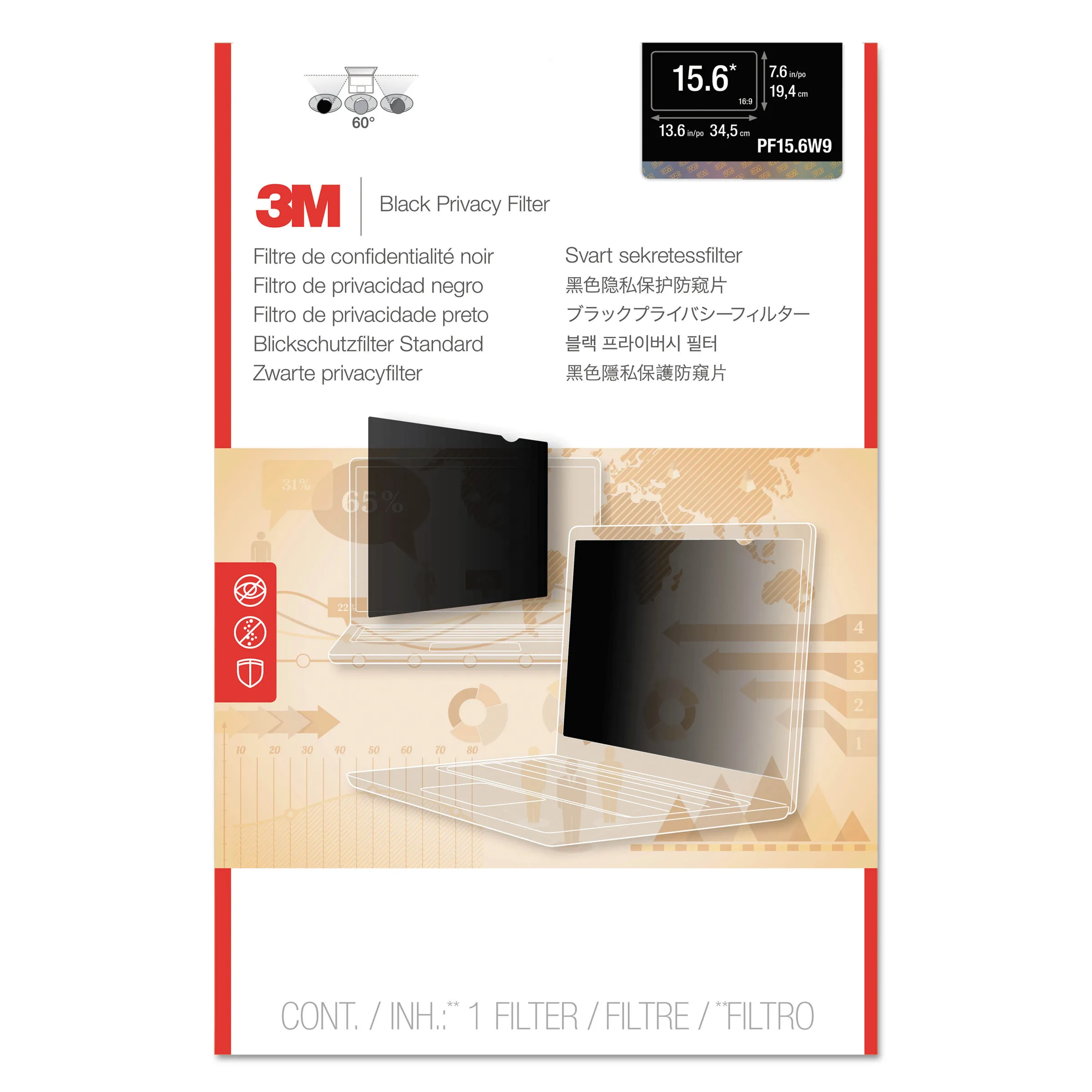 This privacy filter gives your high-resolution screen protection from visual hackers without getting in the way of using your device. It is custom-cut for some of today's slimmest touch-screen devices and adds an extra layer of edge-to-edge protection from everyday scratches and dust. Microlouver technology delivers world-class, effective, "black out" privacy from side views outside the 60-degree viewing angle and reduces 35 percent of blue light transmission from the display. Privacy filter includes COMPLY Attachment System to quickly and easily switch from world-class privacy to screen sharing with one simple flip. Satin-like matte finish is smooth to the touch. Filter is designed to fit full-screen laptops with a diagonally measured, 14" viewing screen and a 16:9 aspect ratio. Actual filter dimensions are 12.5" wide x 6.875" high (318mm x 175mm).