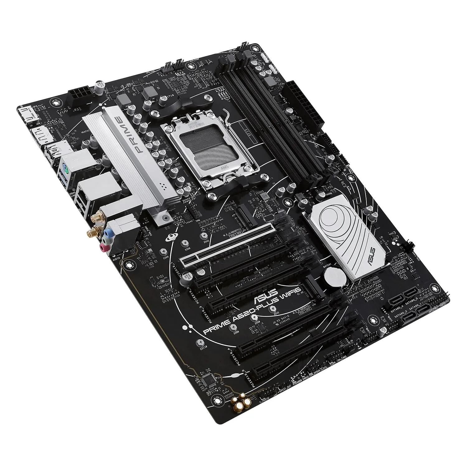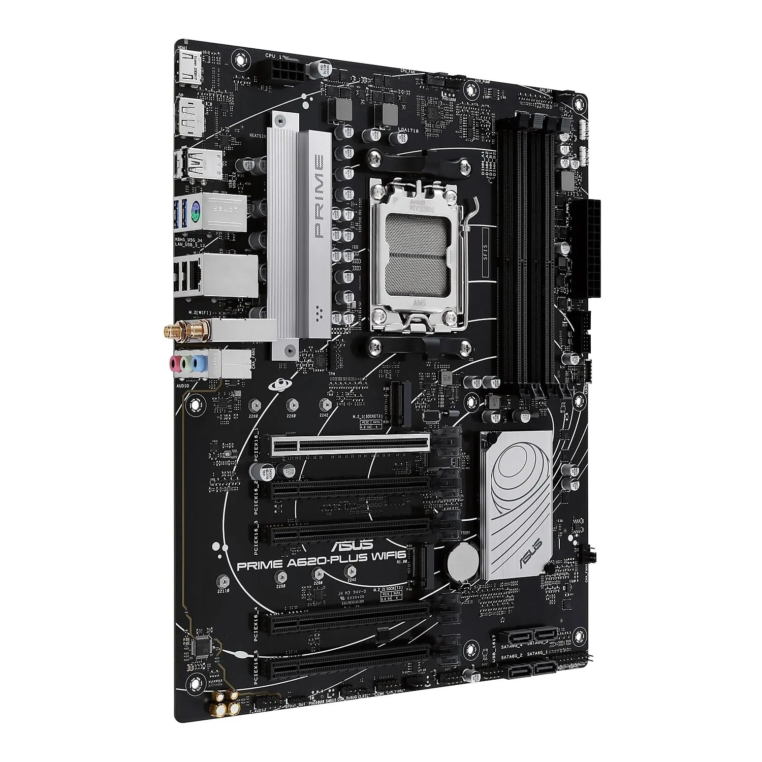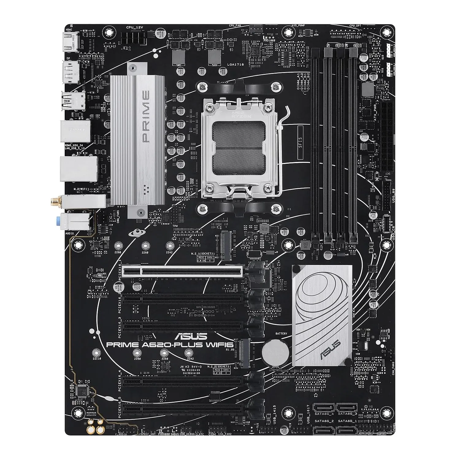 The ASUS PRIME A620-PLUS WiFi 6 is an advanced ATX motherboard designed for AMD AM5 processors, supporting up to 192GB of DDR5 memory. Its features include dual M.2 slots for high-speed SSDs, PCIe 4.0 support for faster data transfers, and built-in WiFi 6 connectivity. The board provides multiple video outputs including DisplayPort and HDMI, along with ample USB connectivity options for various peripherals.