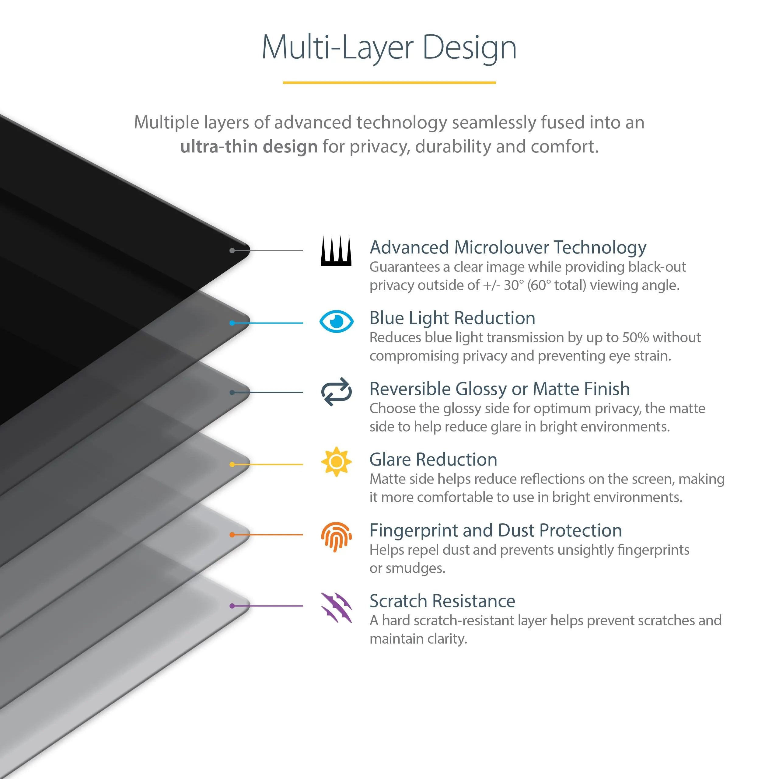 Startech PRIVSCNMON32 - 32 inch monitor privacy screen for security outside +/-30 viewing angle ensures your 16:9 32" widescreen desktop computer display is confidential - Mount w/ adhesive strips that won't leave permanent residue - Apply the removable monitor privacy filter to monitor bezel w/ side mount tabs or directly to screen for long use - Relieve eye strain by reducing blue light 30-40% - Screen protector prevents scratches fingerprints dust - Reversible anti-glare matte or high-clarity glossy finish cover.