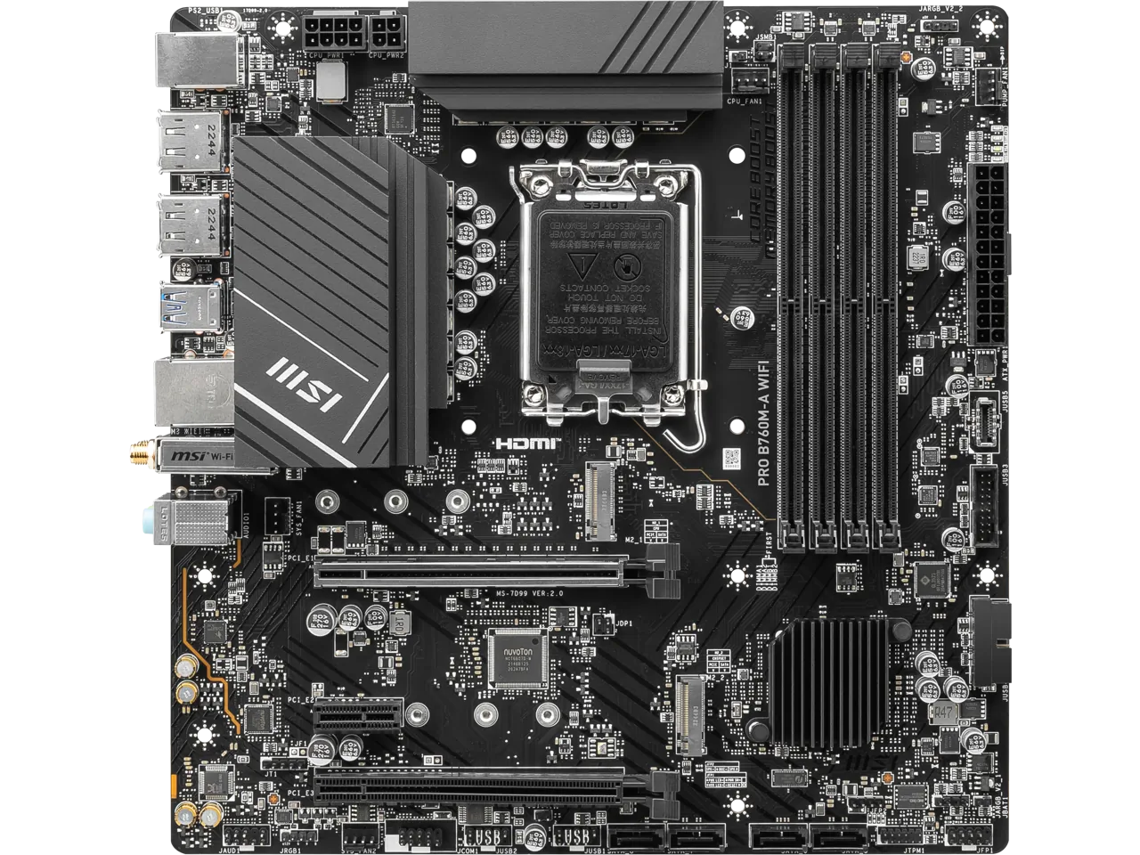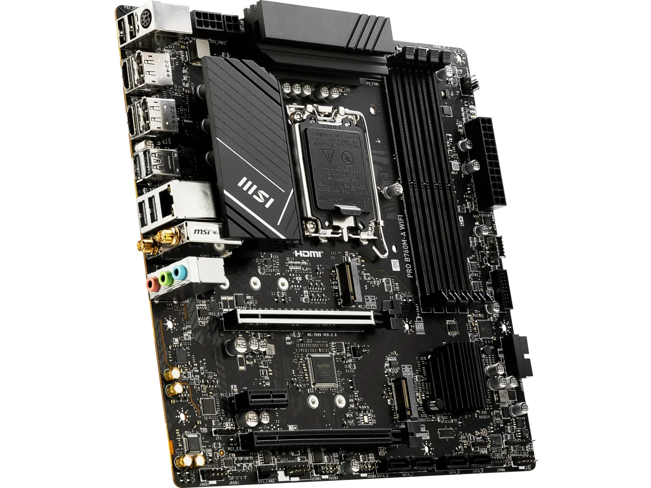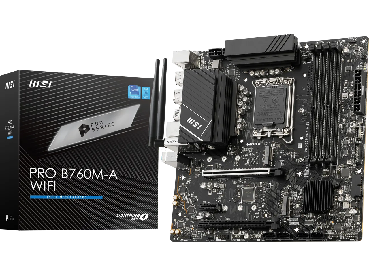 The MSI PRO B760M-A WIFI is a micro ATX motherboard designed for powerful computing and gaming. Featuring an LGA 1700 socket, this motherboard supports Intel’s latest 12th and 13th generation processors. It is equipped with DDR5 RAM support and provides high-speed SATA 6Gb/s connections.