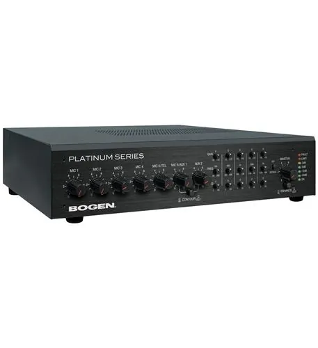 Key features include selectable phantom power for microphones, multiple aux inputs, and comprehensive EQ controls tailored for optimal sound quality. The unit's 8-ohm, 25V/70V speaker output ensures compatibility with various speaker systems, making it an ideal choice for venues of all sizes.
