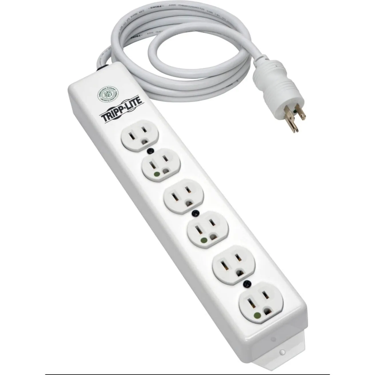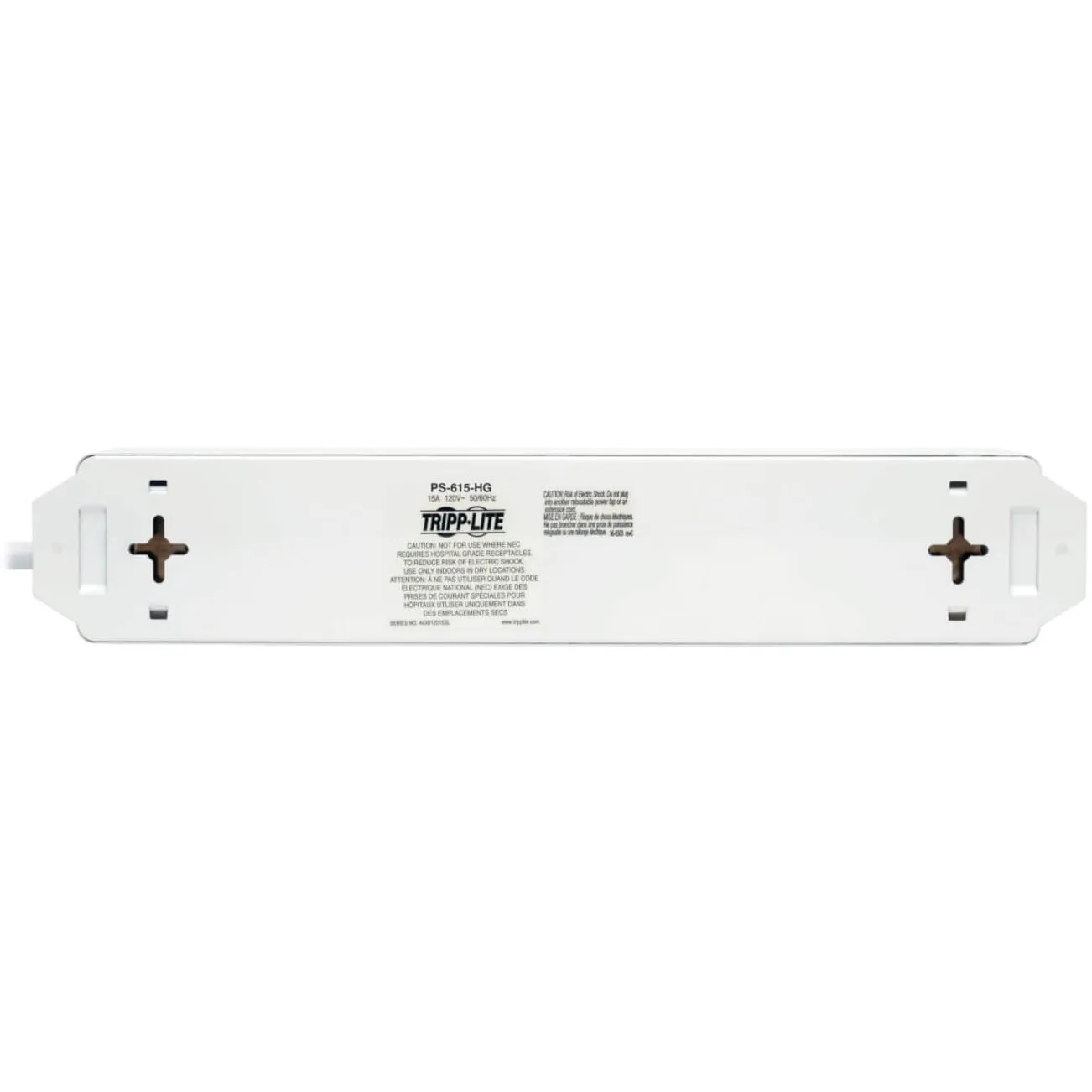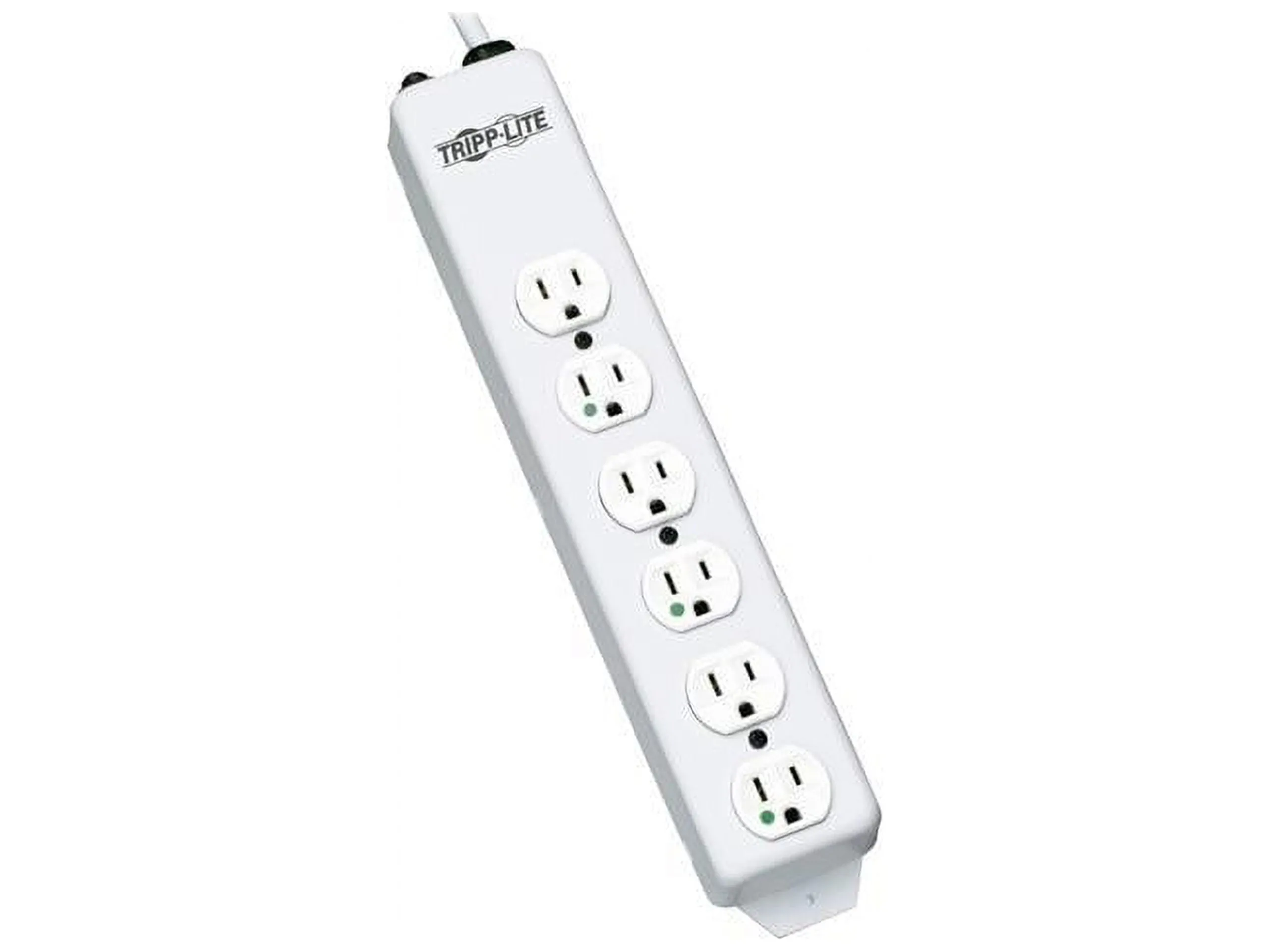 Tripp Lite's PS-615-HG Power Strip offers 15A capacity AC power distribution in a rugged all-metal outlet strip for 120V applications. Features 6 hospital grade-receptacles, 15-ft. AC power cord and built-in resettable circuit breaker. Switchless design prevents accidental shutoff. Optional-use keyhole mounting tabs and flanges. PLUG/OUTLETS: NEMA 5-15P-HG hospital-grade plug and 6 NEMA 5-15R-HG hospital-grade receptacles ELECTRICAL: 120V AC, 50/60Hz, 15A FORMAT: All-metal corded multi-outlet strip Rugged all-metal housing withstands years of use without breakage 6 x NEMA 5-15R-HG hospital-grade output receptacles 15-ft. AC cord with integrated, molded NEMA 5-15P-HG hospital-grade plug Optional-use keyhole mounting tabs and flanges. Switchless design prevents accidental shutoff 15A electrical capacity with built-in resettable circuit breaker 120V, 50/60Hz electrical compatibility Certified by UL (USA) and cUL (Canada) Applications AC power distribution with hospital-grade receptacles and plug where durability and reliability are required. Not for use where NEC requires hospital-grade receptacles. Package Includes PS-615-HG Power Strip User manual with warranty information