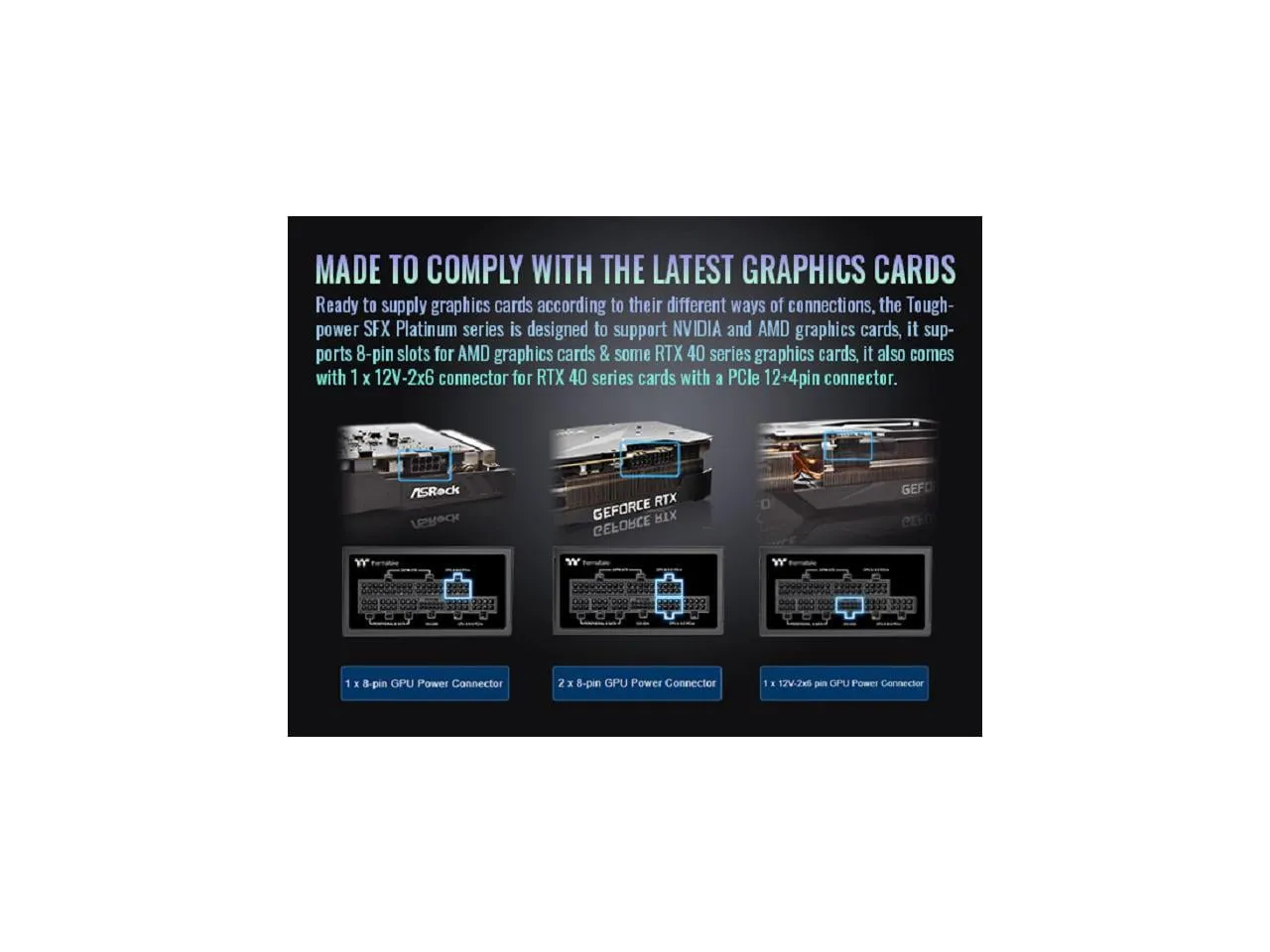 The Toughpower SFX Platinum series power supply unit is designed for cutting-edge hardware support, adhering to the latest Intel SFX 12V 4.1 and ATX 12V 3.1 standards. Equipped with a native PCIe 12V-2x6 (12+4pin) modular interface, it efficiently supplies power to PCIe 12+4pin graphics cards.