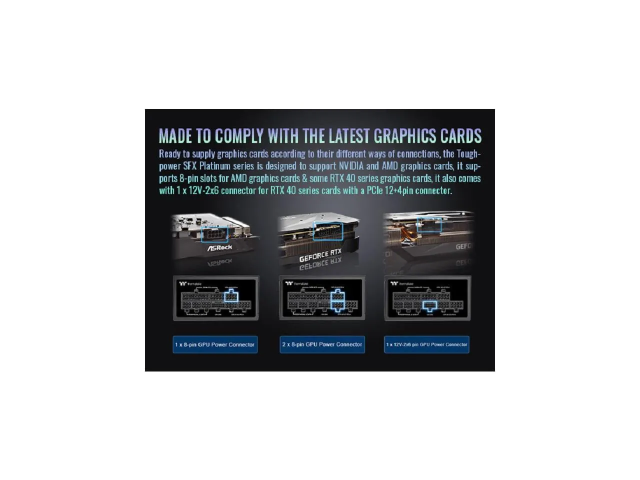 The Toughpower SFX Platinum series is designed to cater to the power requirements of next-generation hardware, complying with the latest Intel SFX 12V 4.1 and ATX 12V 3.1 standards. Its modular interface features a native PCIe 12V-2x6 (12+4pin) connection, making it suitable for high-performance graphics cards.