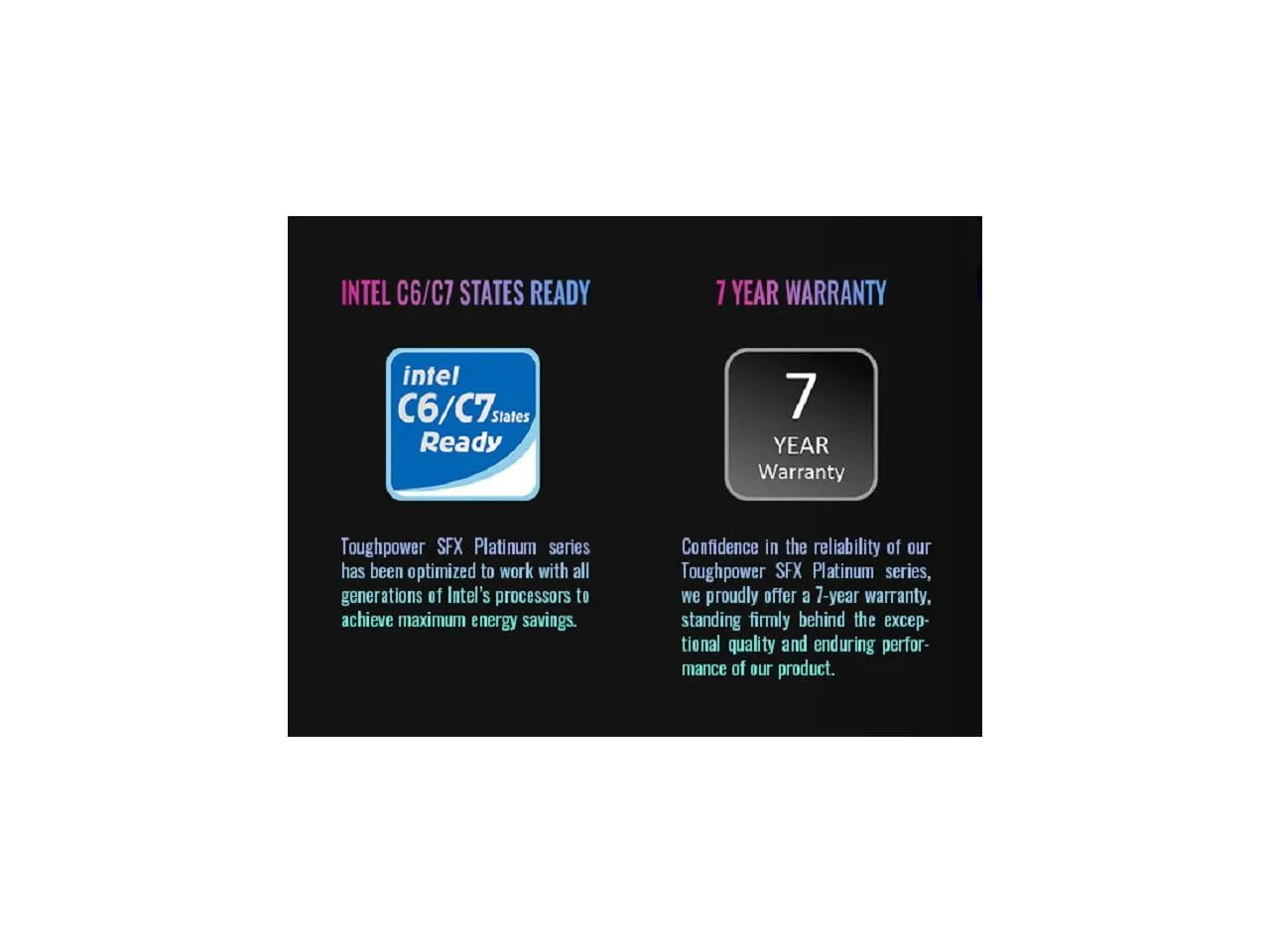 The Toughpower SFX Platinum Power Supply Unit is engineered to support the latest generation of hardware, conforming to the Intel SFX 12V 4.1 and ATX 12V 3.1 standards. It features a native PCIe 12V-2x6 (12+4pin) modular interface, allowing efficient powering of modern PCIe 12+4pin graphics cards. With an impressive 80 PLUS Platinum efficiency rating, this power supply ensures optimal energy usage while maintaining exceptional stability, durability, and reliability.