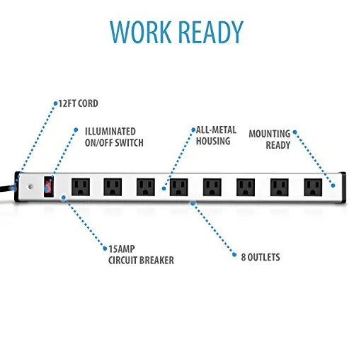 This heavy-duty power strip features 8 outlets and a long 12-foot cord, ensuring you have ample reach for your power needs.