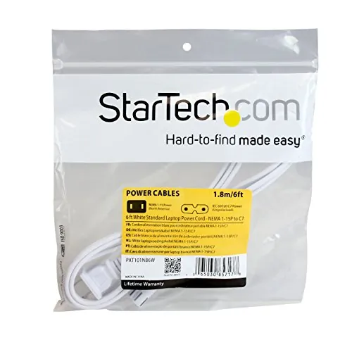 Ensure your laptop stays powered with this high-quality 6 ft white power cord, designed for reliable performance. This cord features a NEMA 1-15P plug on one end and an IEC 60320 C7 connector on the other, making it perfect for connecting your notebook to a power source.