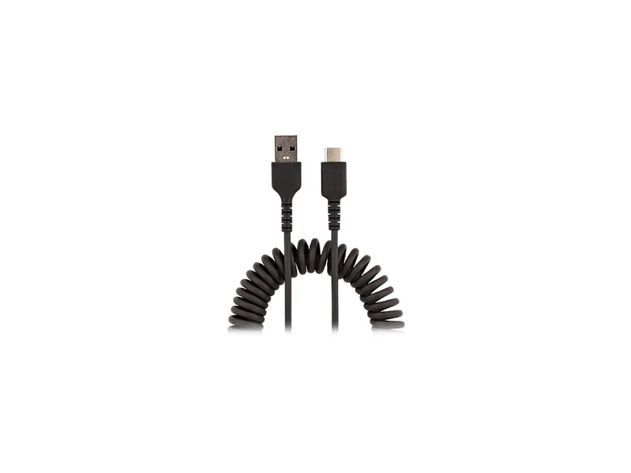 The StarTech Coiled USB A to C Charging Cable offers a compact design with a flexible coiled structure, allowing for easy storage and portability. At 50cm in length, this durable USB 2.0 cable provides quick charging and data synchronization capabilities. Perfect for use with a variety of devices, it features a reliable connection and a sleek black finish.