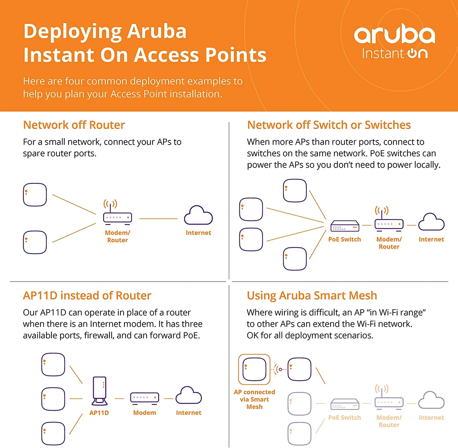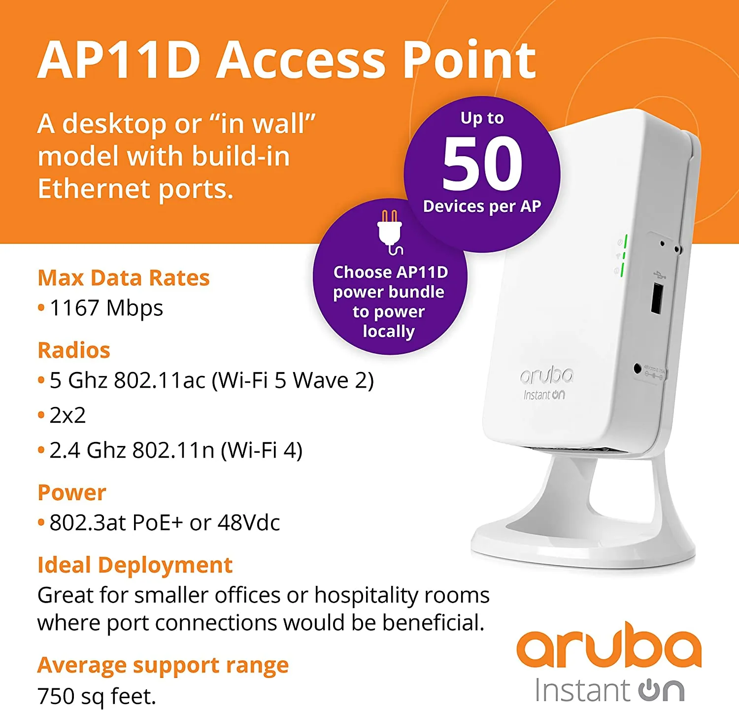 Aruba Instant On AP11D Desk/Wall Access Points deliver affordable, business-grade Wave 2 802.11ac Wi-Fi for low- to medium-density small business environments. They are a perfect choice for delivering in-room Wi-Fi connectivity in offices, hospitality locations like hotel guest rooms, medical clinics, and Airbnb located in the same premises as your main network. Get setup and running in minutes with the Aruba Instant On Cloud app management system.