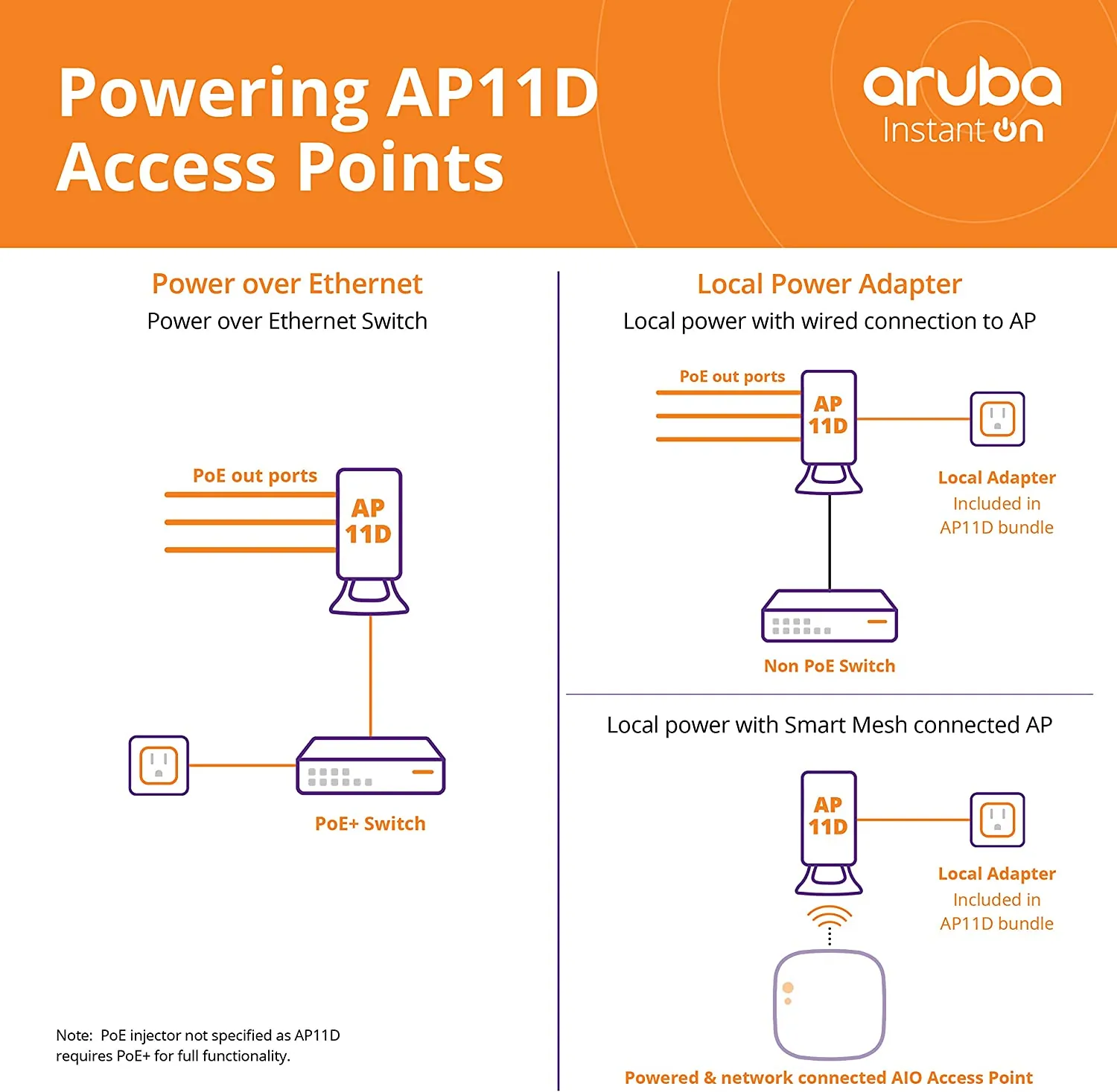 Powering: AP11D APs require Power over Ethernet (802.1at Class 3 PoE+) or a 48V local power adapter. Reason for the extra power is to allow for PoE out on downlink ports. There are two ordering options depending on what power mode you choose. This model (R2J25A) is a power bundle that ships with the 48V power adapter. Also available is model (R2X15A) that is just the unit, most appropriate if you will be provided PoE+ from a switch.