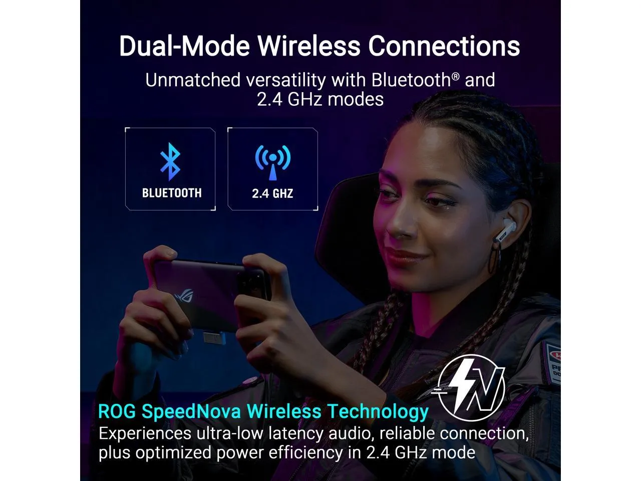 Experience immersive gaming with the ASUS ROG Cetra True Wireless Gaming Headphones. Featuring advanced 2.4 GHz connectivity and Bluetooth 5.3, these headphones ensure a lag-free experience. With ROG SpeedNova technology, enjoy high-fidelity audio at 24-bit 96 kHz, while Dirac Opteo optimizes sound quality. Equipped with Bone-Conduction AI Microphones and Adaptive ANC, communicate clearly in any environment. With an impressive 46-hour battery life, the ASUS ROG Cetra TWS is perfect for extended gaming sessions.
