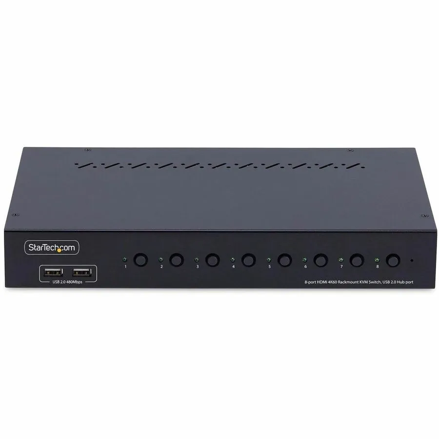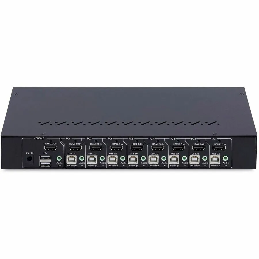 - Switch between 8x HDMI computers to share a keyboard/mouse/4-port usb 2.0 hub/audio/4K 60Hz HDMI 2.0 monitor - TAA-Compliant KVM Switch gives BIOS level control with any OS including Windows/macOS/Linux - Works with all hardware platforms such as Intel/AMD/SnapDragon/ARM/Apple Silicon - Push-button/hotkey switching with audible buzzer; LEDs for visual port selection status - Includes rackmount brackets to install in 1U of rack space; Requires a mounting depth of 6.5in (165mm) or more