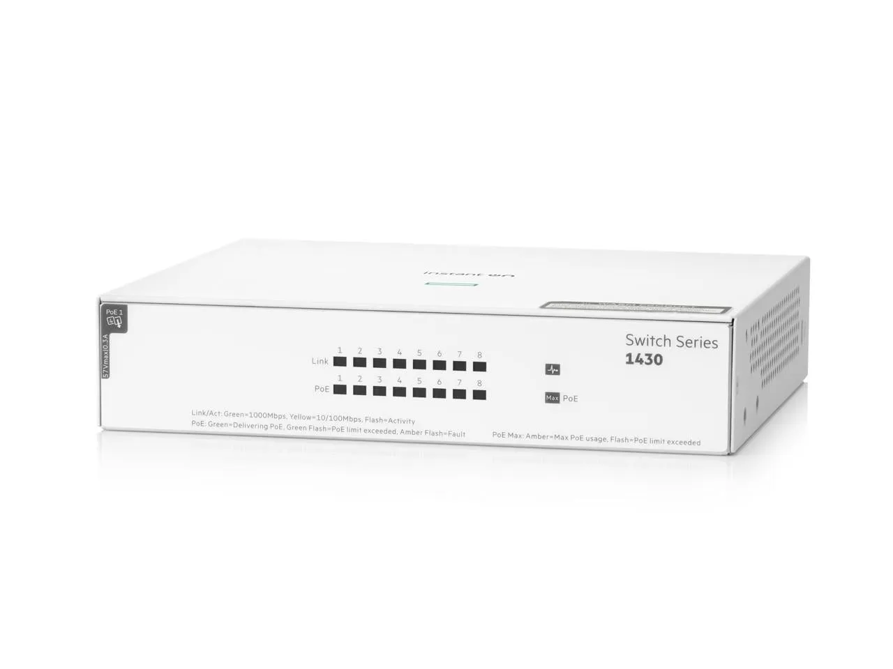 HPE Networking Instant On Switch Series 1430 8-Port Gb Unmanaged Layer 2 Ethernet Switch with PoE - 8x 1G - 8x CL4 PoE (64W) - Fan-less - US Cord (R8R46A#ABA)