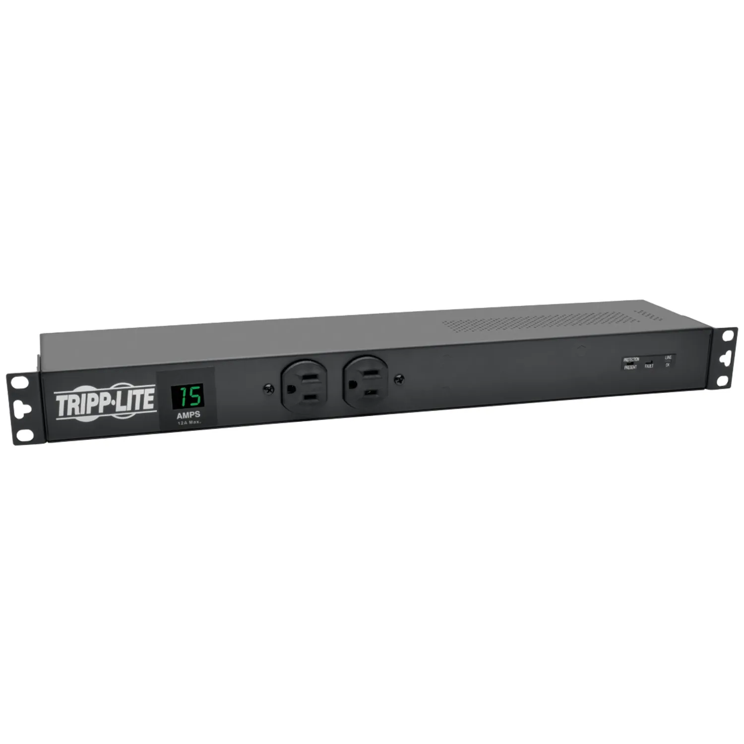 The Tripp Lite 1U Rack Mount 1.44kW Single-Phase 15-Amp Metered PDU with Isobar Surge Suppression offers real-time local reporting of load level in amps, plus premium ISOBAR network-grade AC surge and noise suppression. The Digital display continuously reports the power distribution unit's output current to prevent circuit overloads as additional equipment is added. A set of 3 front panel LEDs provide notification of wiring fault, protection present and line OK status. The high quality design of this PDU includes rugged all metal housing and secure rack mount installation with included mounting accessories.
