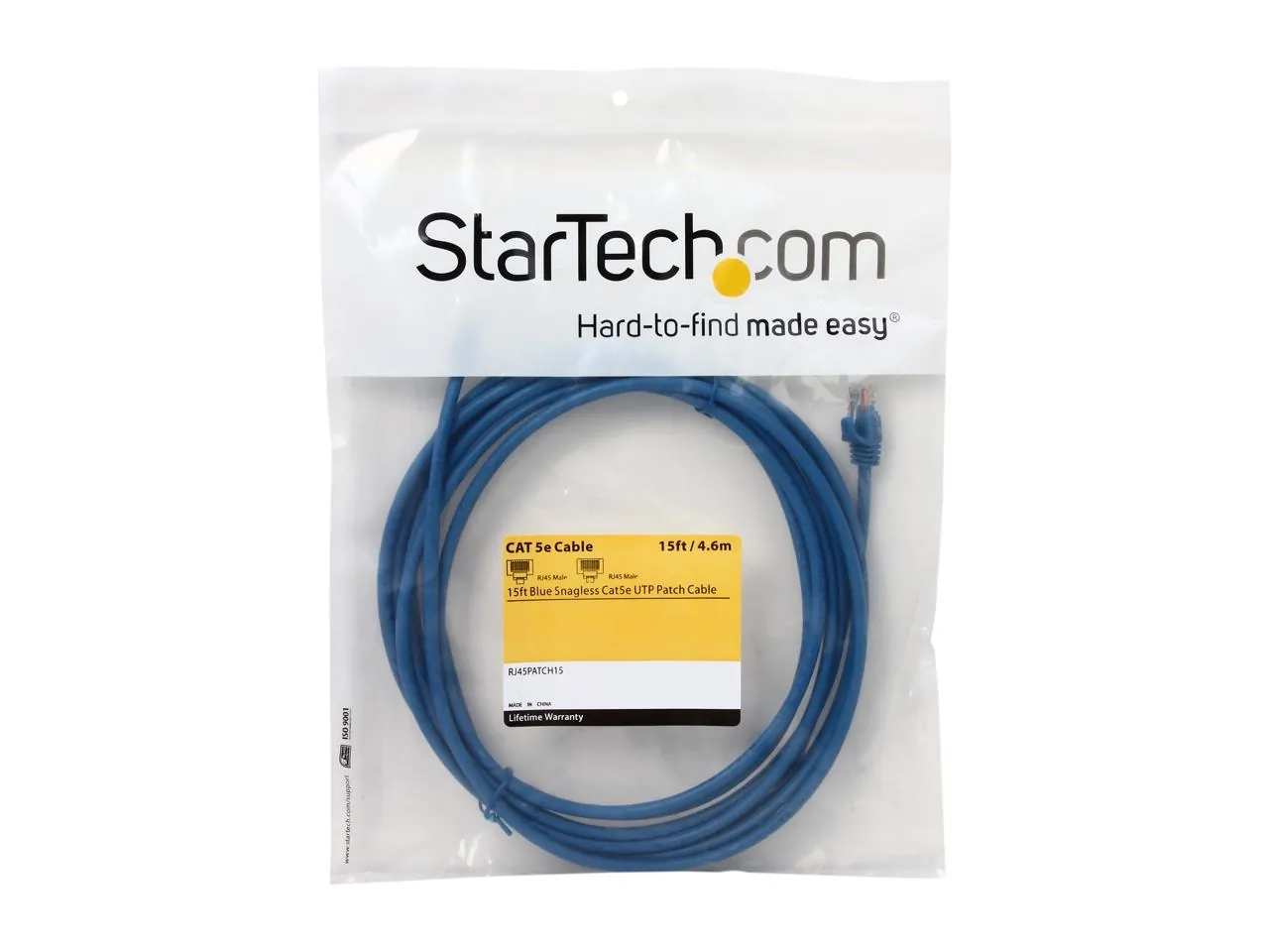 The 15 ft. Cat 5E Blue Snagless UTP Patch Cable is designed for connecting networking devices such as computers, switches, and routers with ease. Its snagless design prevents tangling and damage to the connector during installation and use.