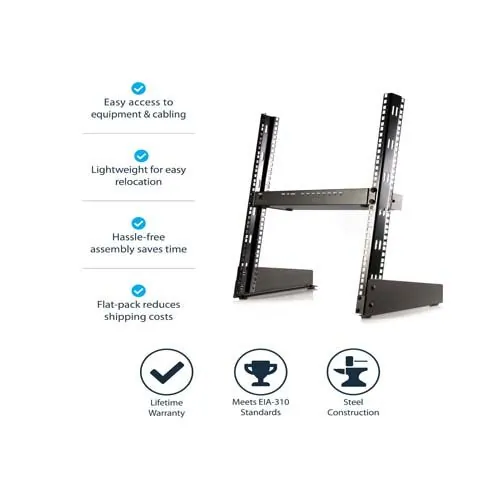 Mount a variety of equipment and free up floor space with the StarTech 12U 19" Desktop Open Frame 2-Post Rack. It's well suited or smaller equipment that does not require a full-size cabinet such as audio devices, KVMs and more. Featuring a compact and free-standing design, this open-frame rack is suitable for installation on or around your desk, providing easy access to your device and helping to save valuable space in the office. It's also made out of steel and is easy to assemble and relocate to a new spot if needed. Included are 20 M5 screws and cage nuts for easy setup and for mounting equipment at various positions. The StarTech 12U 19" Desktop Open Frame 2-Post Rack meets EIA standards and is TAA compliant for GSA Schedule purchases. Numerous available mounting positions offer customization and accommodation for device models in different sizes, meeting the individual needs of an organization.