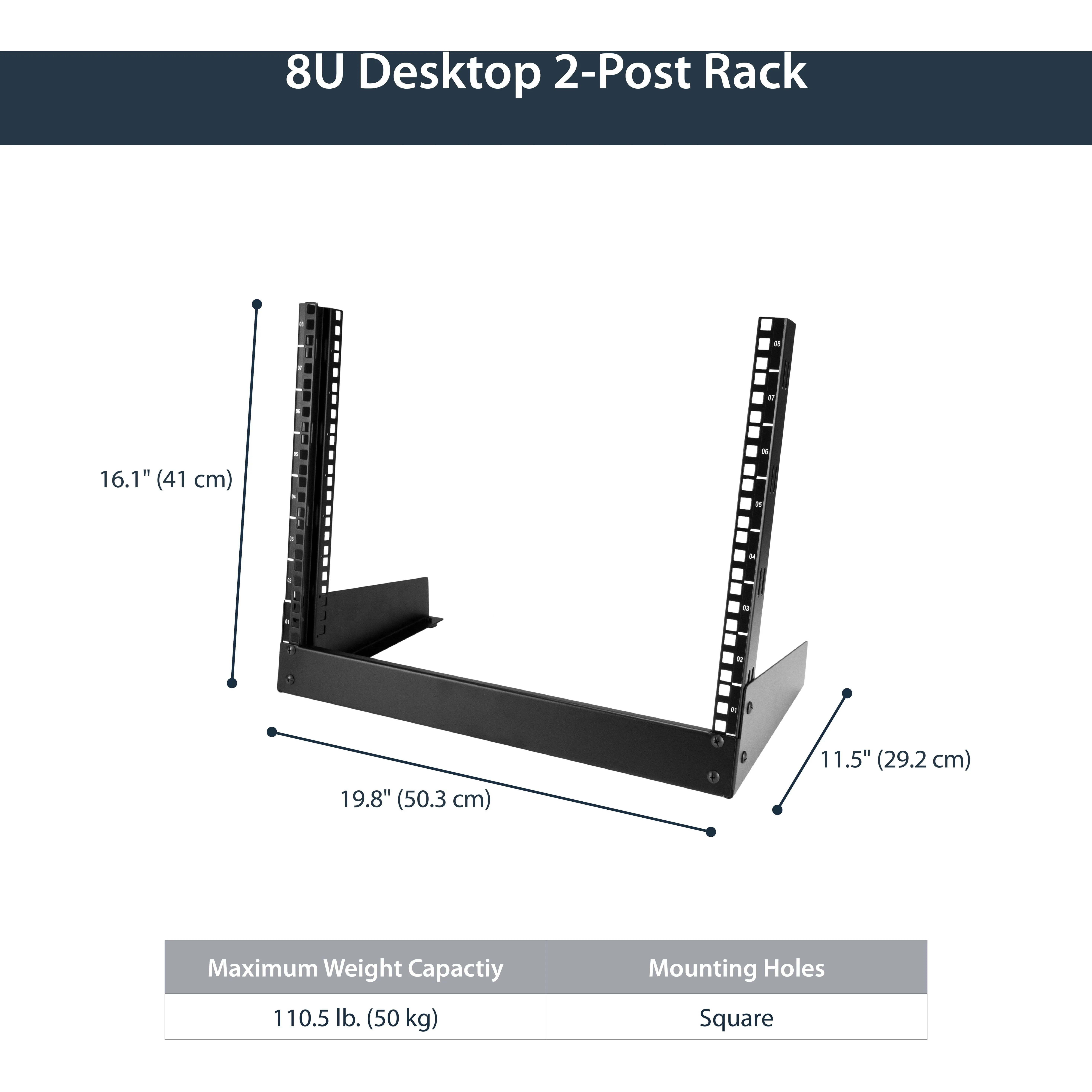 This 2-post desktop rack provides 8U of storage space for mounting smaller A/V and IT equipment.