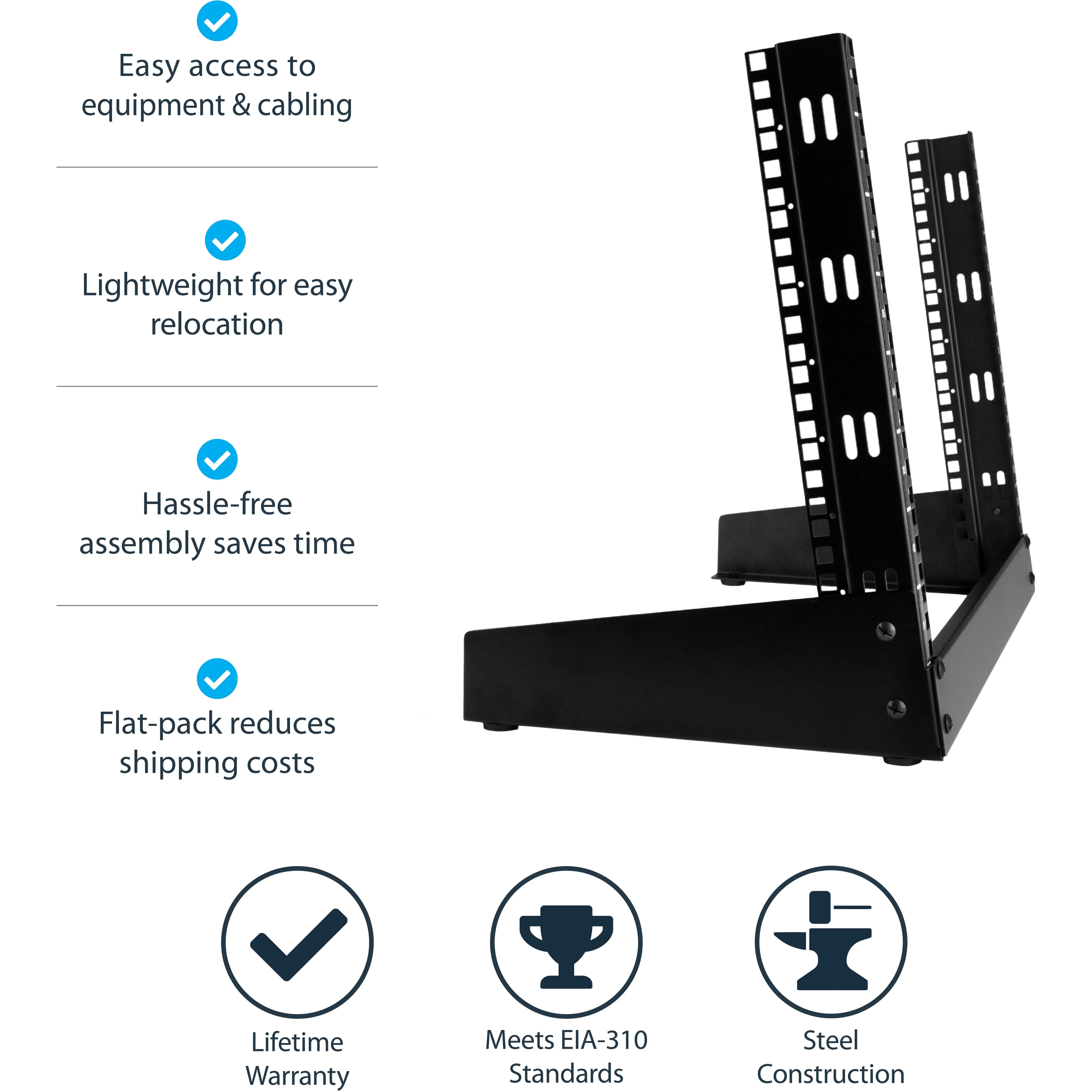 The rack features an open frame, free standing design that saves space with a small footprint. It gives you the ability to place rack-mount equipment on any surface in your office, such as your desk. This makes it easy to access your equipment on a daily basis.