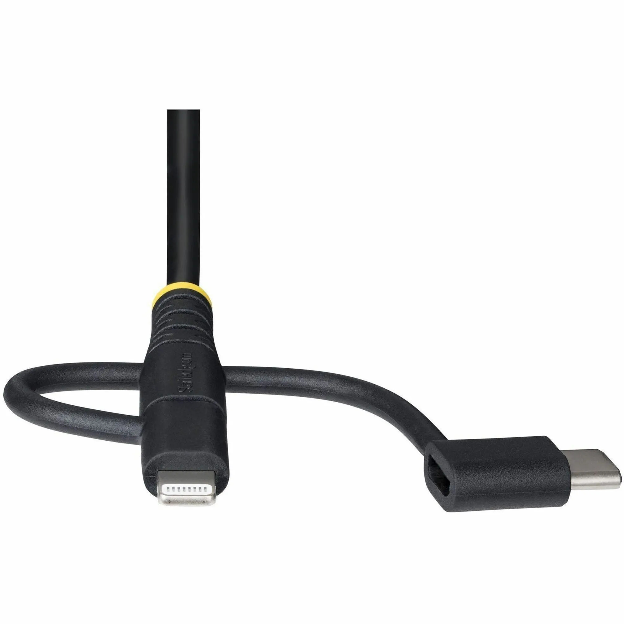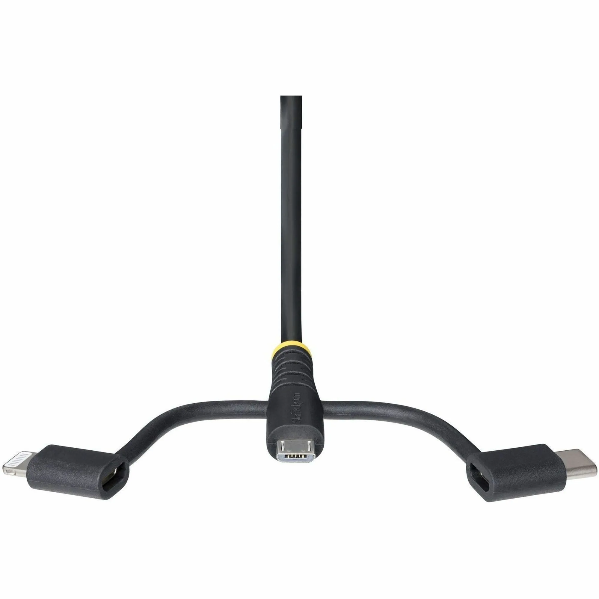 Simplify USB charging using this 3-in-1 cable compatible with multiple devices; Apple MFi Certified Lightning connector; Supports USB-C and Micro-USB devices - Rugged cable design w/Aramid fiber; Flexible TPE jacket withstands 30,000+ bends at -/+90deg - Ideal for traveling or daily use; Charge one device at a time from a USB-A wall charger - Black; 1-meter (3.3-foot); USB-A to Micro-USB/USB-C/Lightning; Up to 15W 3A; USB 480Mbps; Al-Mylar Shield; Cable O.D.: 5.6mm (0.18in).