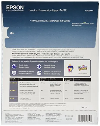 Epson Premium Presentation Paper Matte offers exceptional quality for prints with a smooth surface that is ideal for photos and documents. Each package contains 50 sheets, perfectly sized at 8.5" x 11" to fit standard printers. Its quick-drying properties help prevent smudging, ensuring your prints look crisp and professional.