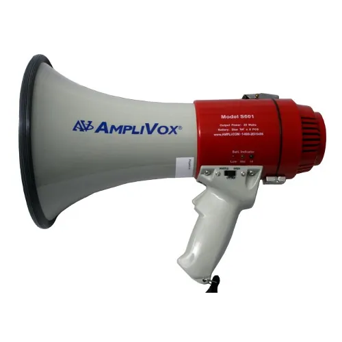 Features Piezo Dynamic Technology that delivers powerful performance while significantly reducing weight and increasing battery life. Full frequency response provides clear, intelligible amplification. Adjustable volume and three modes (talk, siren and whistle) offer enhanced versatility. Battery indicator light vividly shows power status. Weatherproof design stands up to inclement weather. Pistol grip and wrist strap make it comfortable to hold.