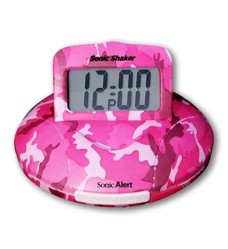 - Travel alarm clock with bed shaker- 90dB extra loud alarm- Sonic Shaker vibrating unit- Pop up display with convenience light- Test button to test batteries, vibrator, and sound operation- Easy to set function keys- Easy to read .75" display- Continuous four minute snooze setting- Swivel and flush mounted display protects settings