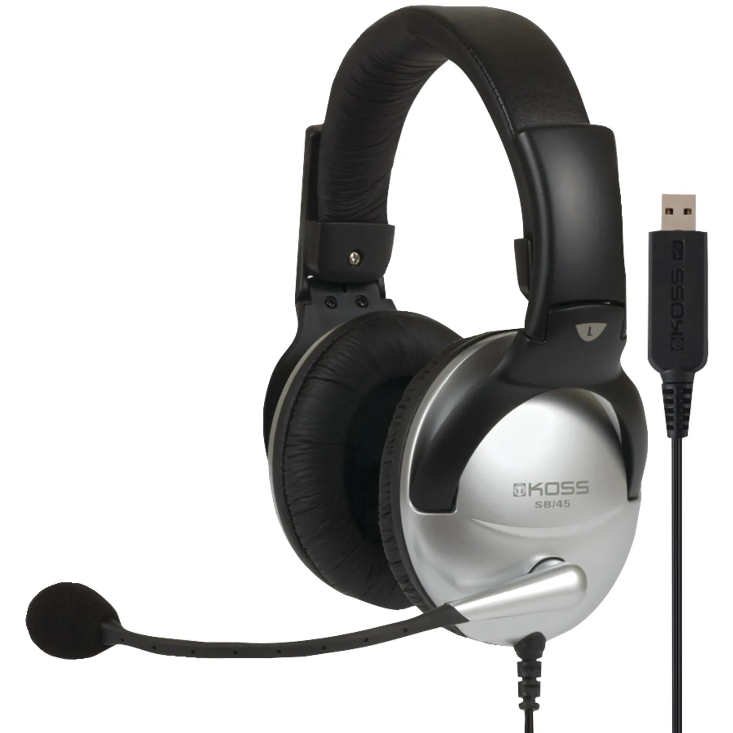 Koss SB45 USB Communication HeadsetsThe SB45USB headset provides plenty of freedom with wired connectivityListen to distinct sounds from both the speakers in stereo sound modeHear low subs and soaring vocals with a frequency range of sound from 18 Hz-20 kHzListen to your favorite music with this over-the-head design headsetYour voice will be heard loud and clear with the boom microphoneFeatures USB connectorCircumaural design provides optimum comfort and noise isolation