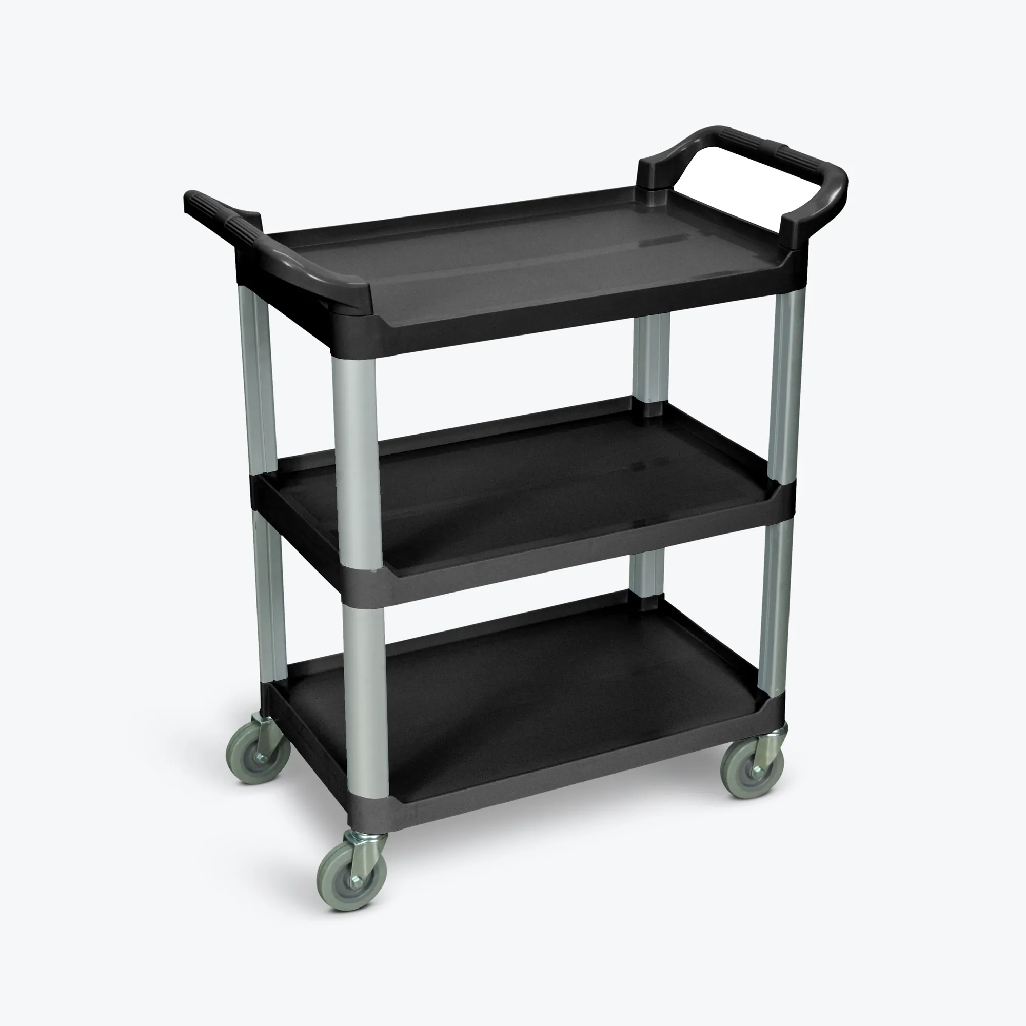 Introducing the Luxor 3-Tier Serving Cart, designed for versatility and ease of use in various settings, including food service, healthcare, and more. This lightweight yet sturdy cart features durable polypropylene shelves that are scratch-resistant and easy to clean. The aluminum uprights provide exceptional strength, enabling it to hold a maximum capacity of 200 lbs.