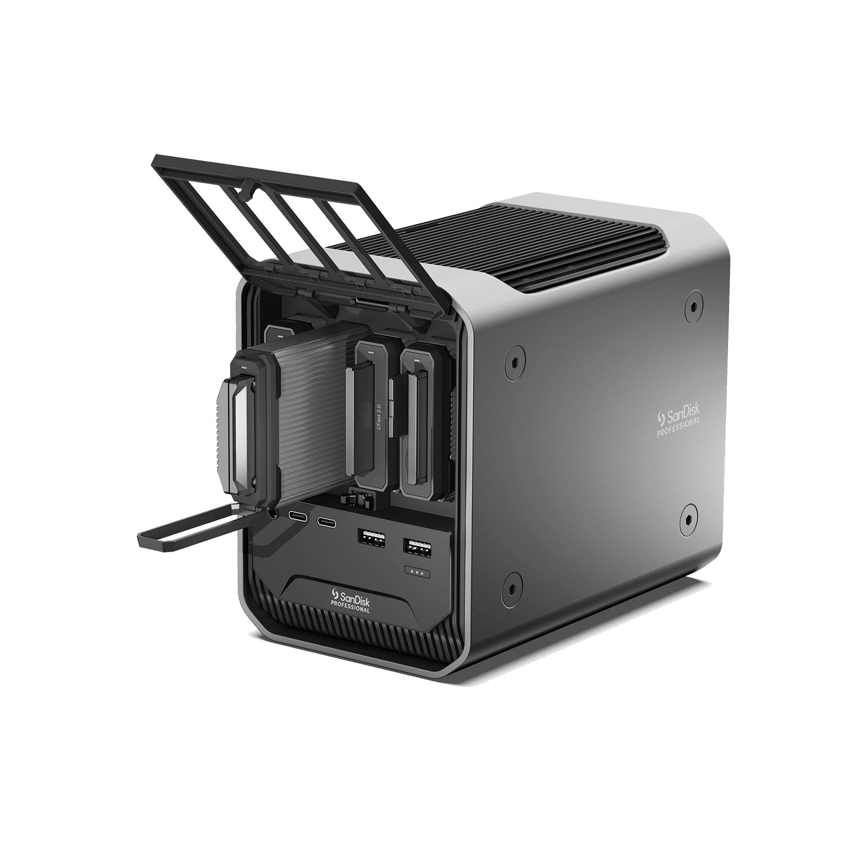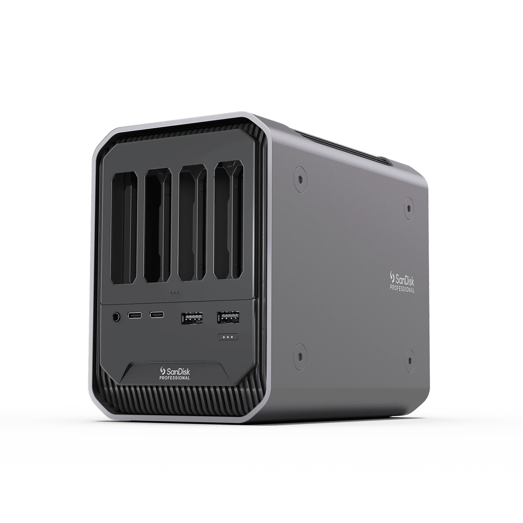 The SanDisk Professional Pro-Doc 4 is a premium 4-bay Thunderbolt reader docking station designed to streamline your workflow. With its sleek design and robust capabilities, it supports multiple card formats to enhance productivity for professional photographers and videographers.