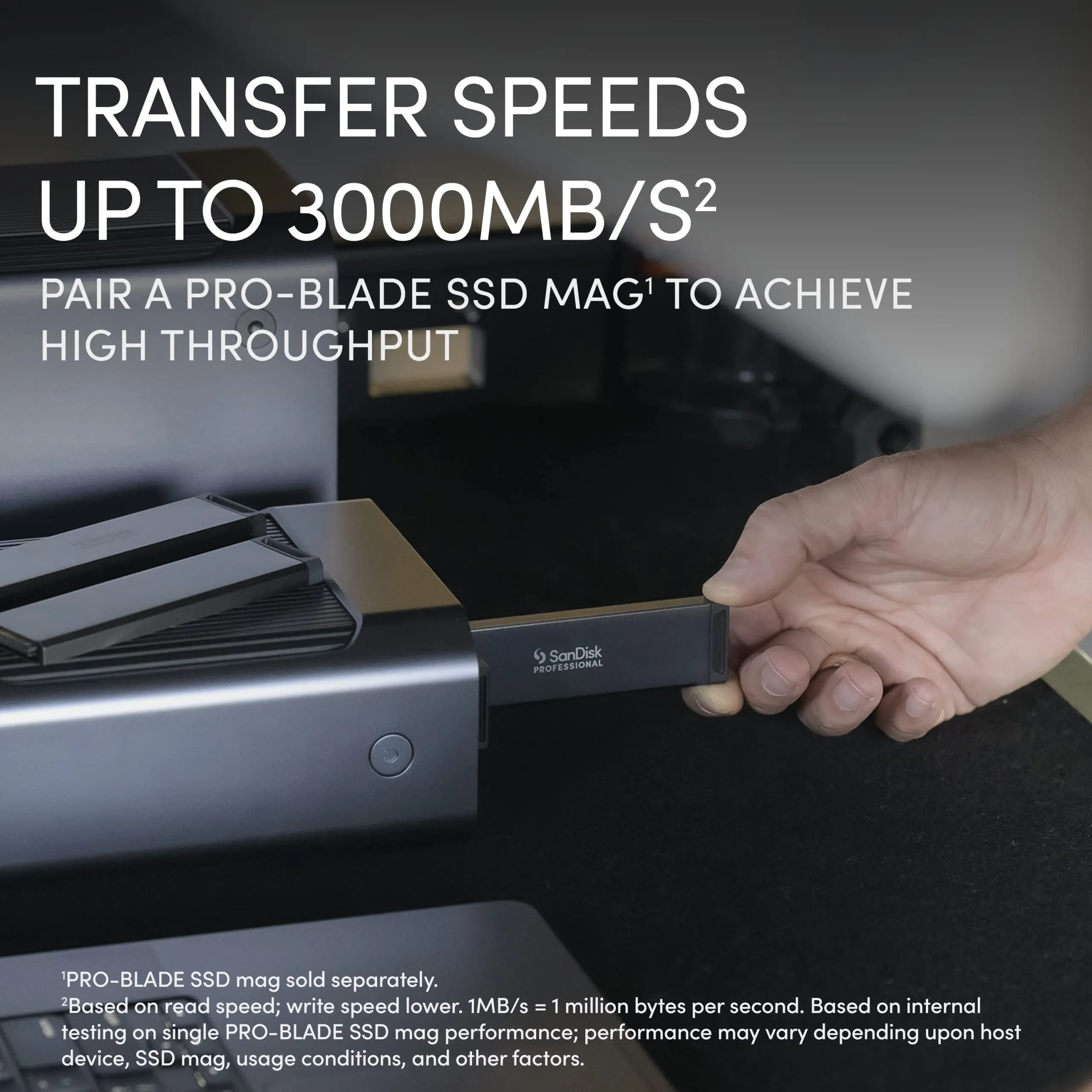 Optimize your workflow with the Pro-Blade Station, featuring Thunderbolt 3 (40Gbps) and USB-C (10Gbps) compatibility for unmatched speed. Utilize its 4 PRO-BLADE SSD mag slots to edit, copy, and transfer vast amounts of data swiftly, boasting speeds up to 3000MB/s read and 2600MB/s write. Eliminate downtime by seamlessly swapping PRO-BLADE SSD mags between the PRO-BLADE TRANSPORT and the PRO-BLADE STATION. The enclosure features flow-through active ventilation to cool the SSD mags and maintain peak performance.